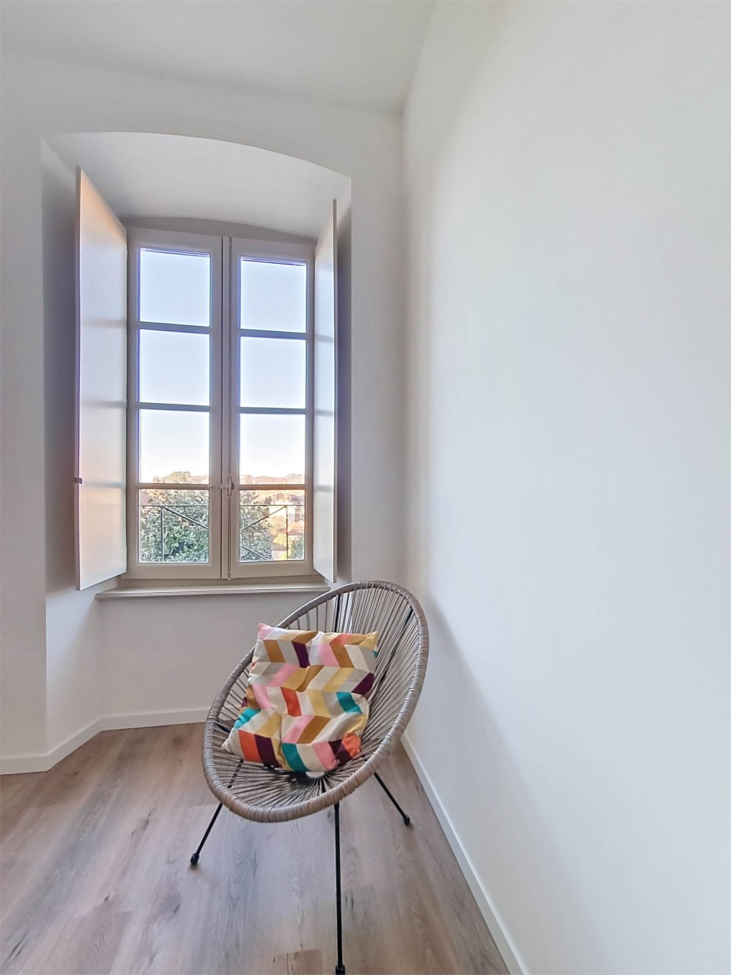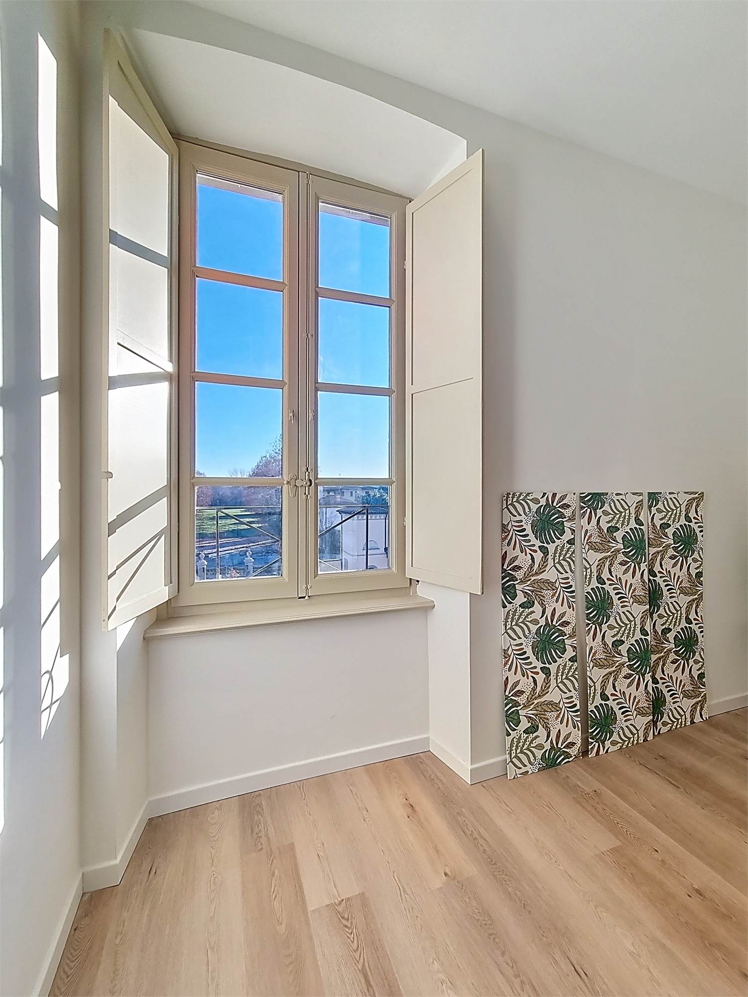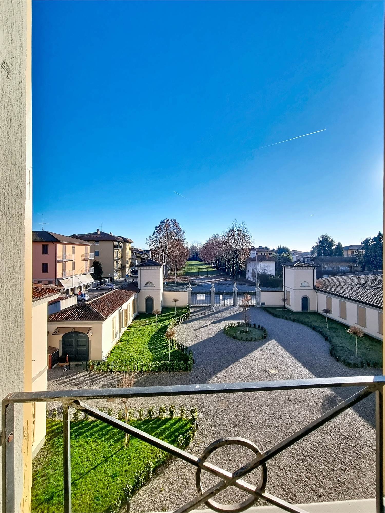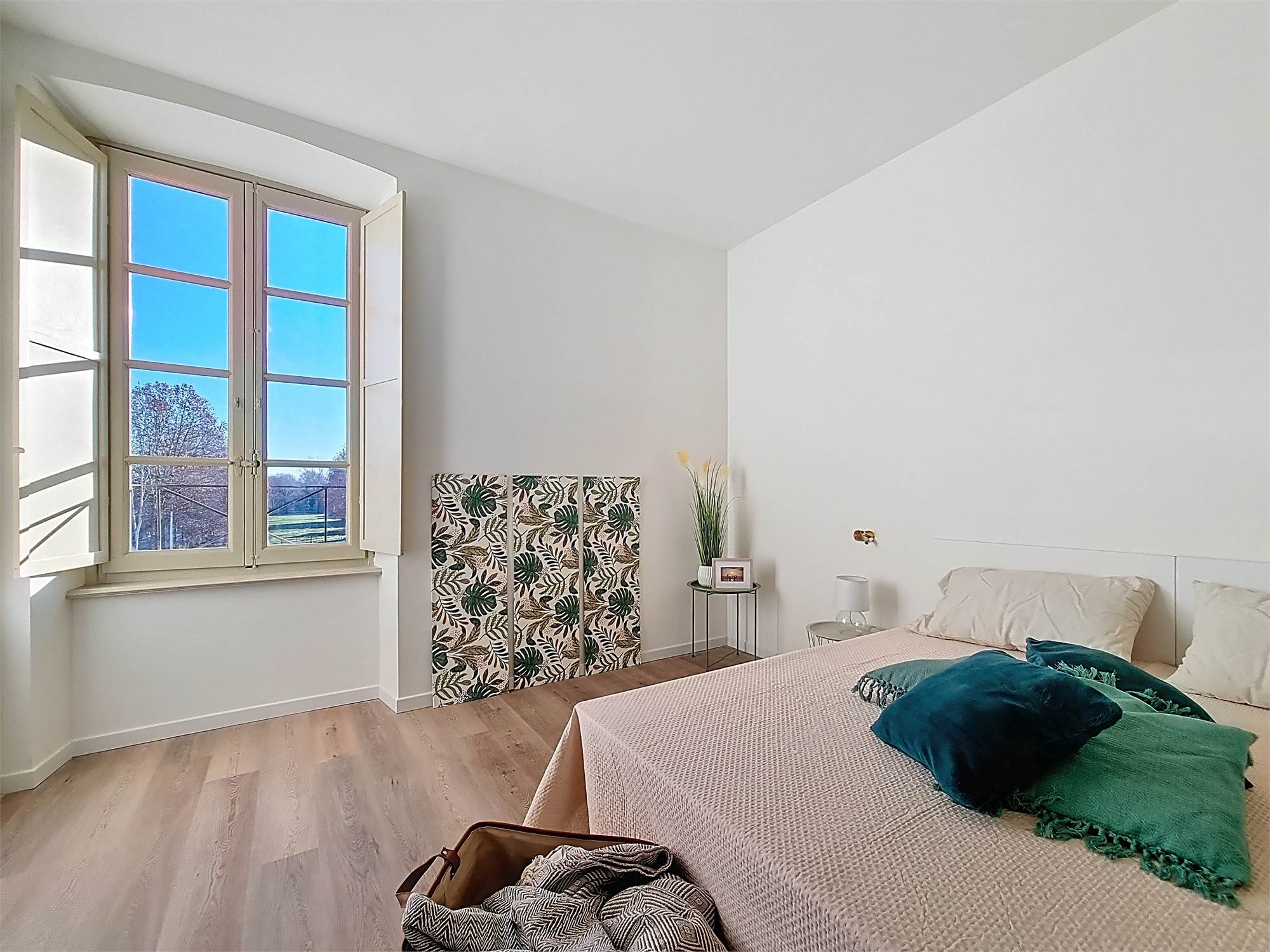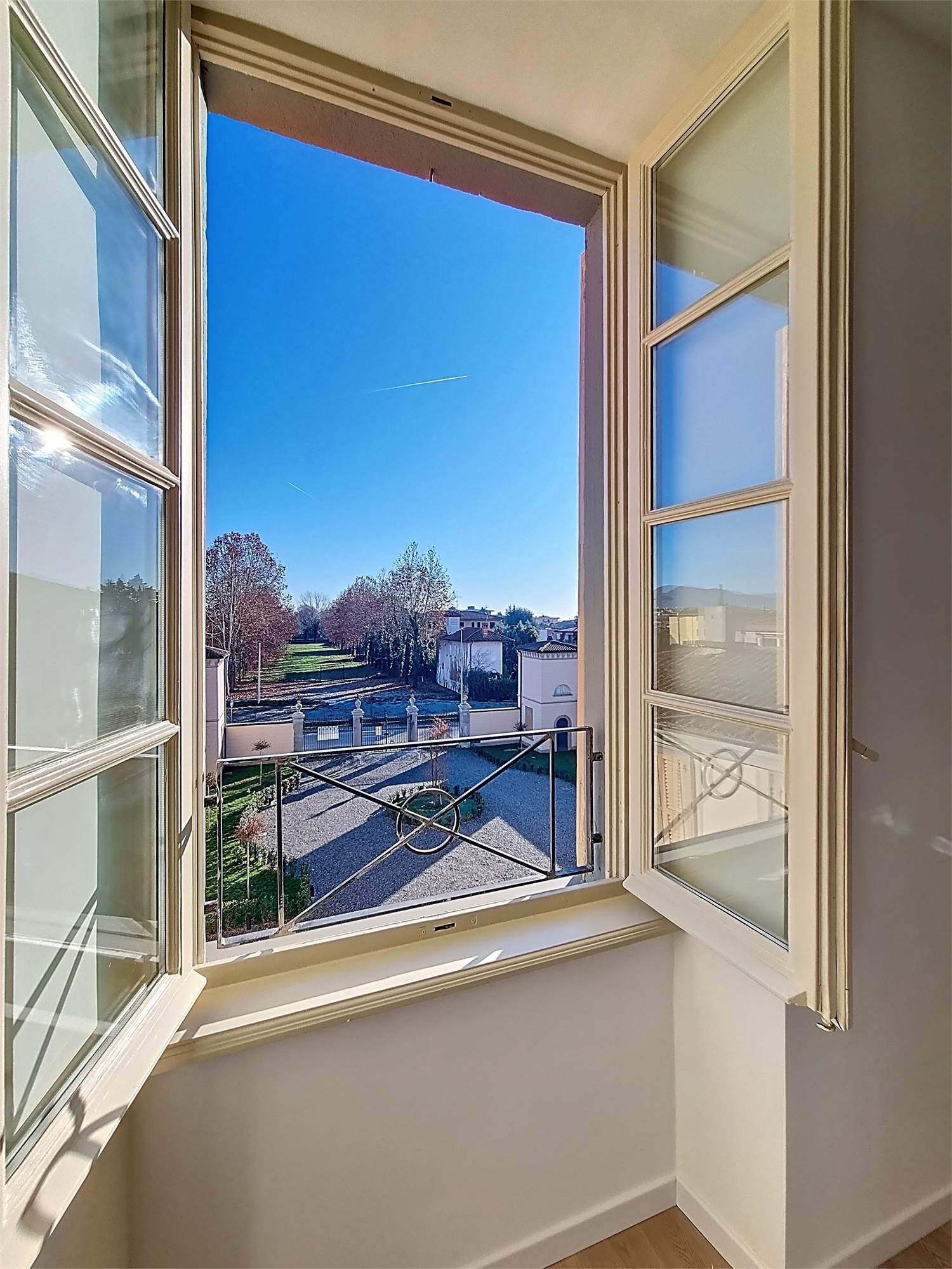 La caratteristica distintiva di questa soluzione è senza dubbio la straordinaria luminosità, unita a una vista impareggiabile sul giardino all’italiana antistante la villa. L’appartamento gode di un affaccio privilegiato sul fronte principale dell’ingresso e di suggestive finestre della cucina che si aprono sugli affreschi del salone nobiliare, creando un dialogo unico tra interni ed arte storica.