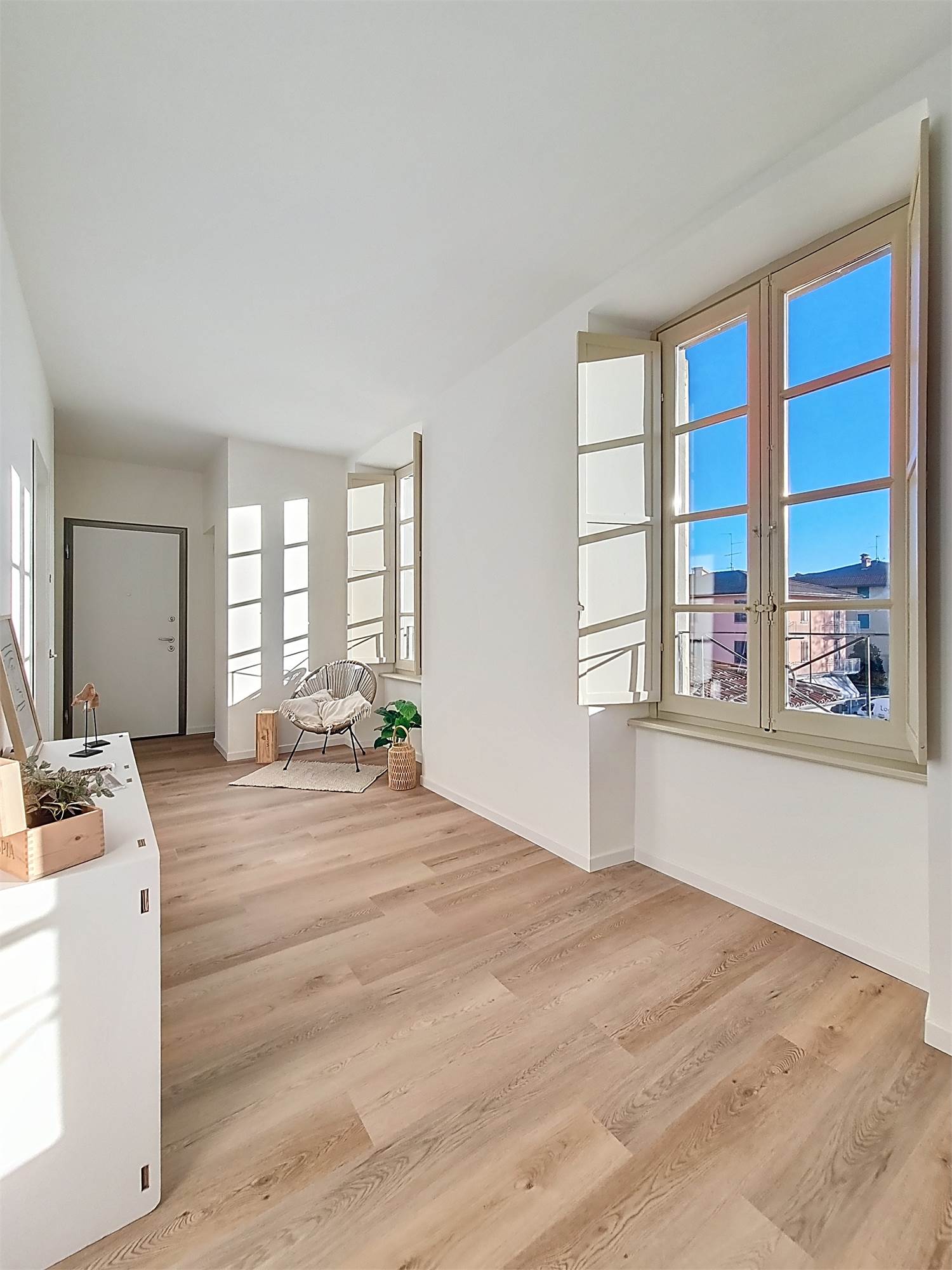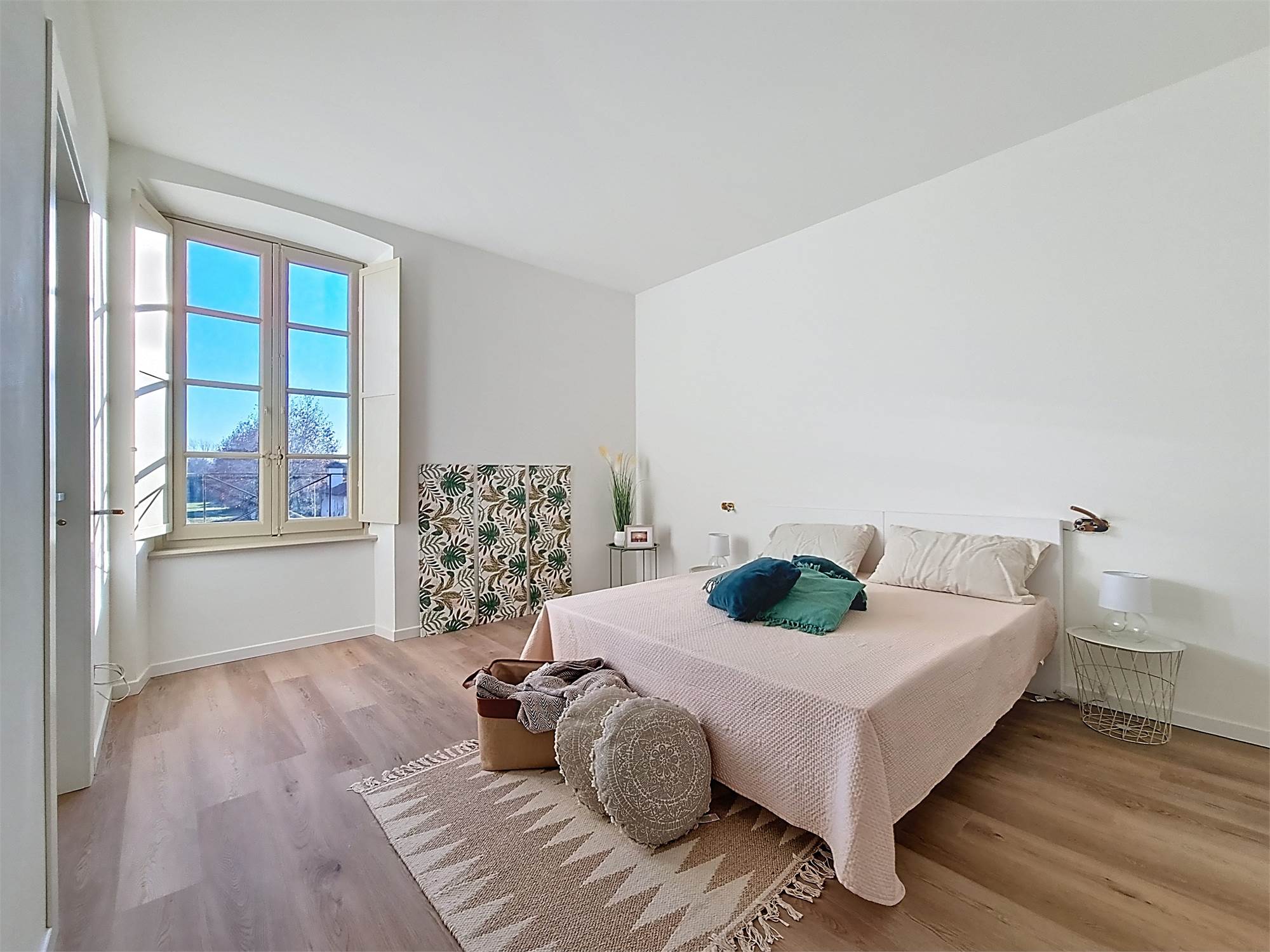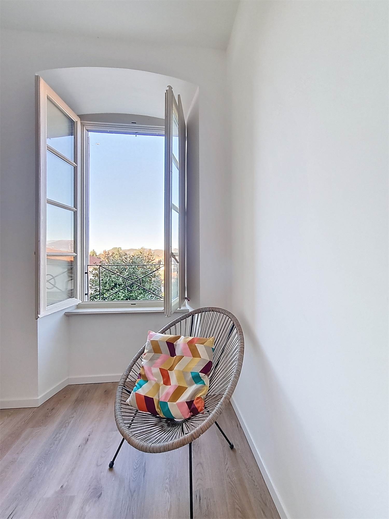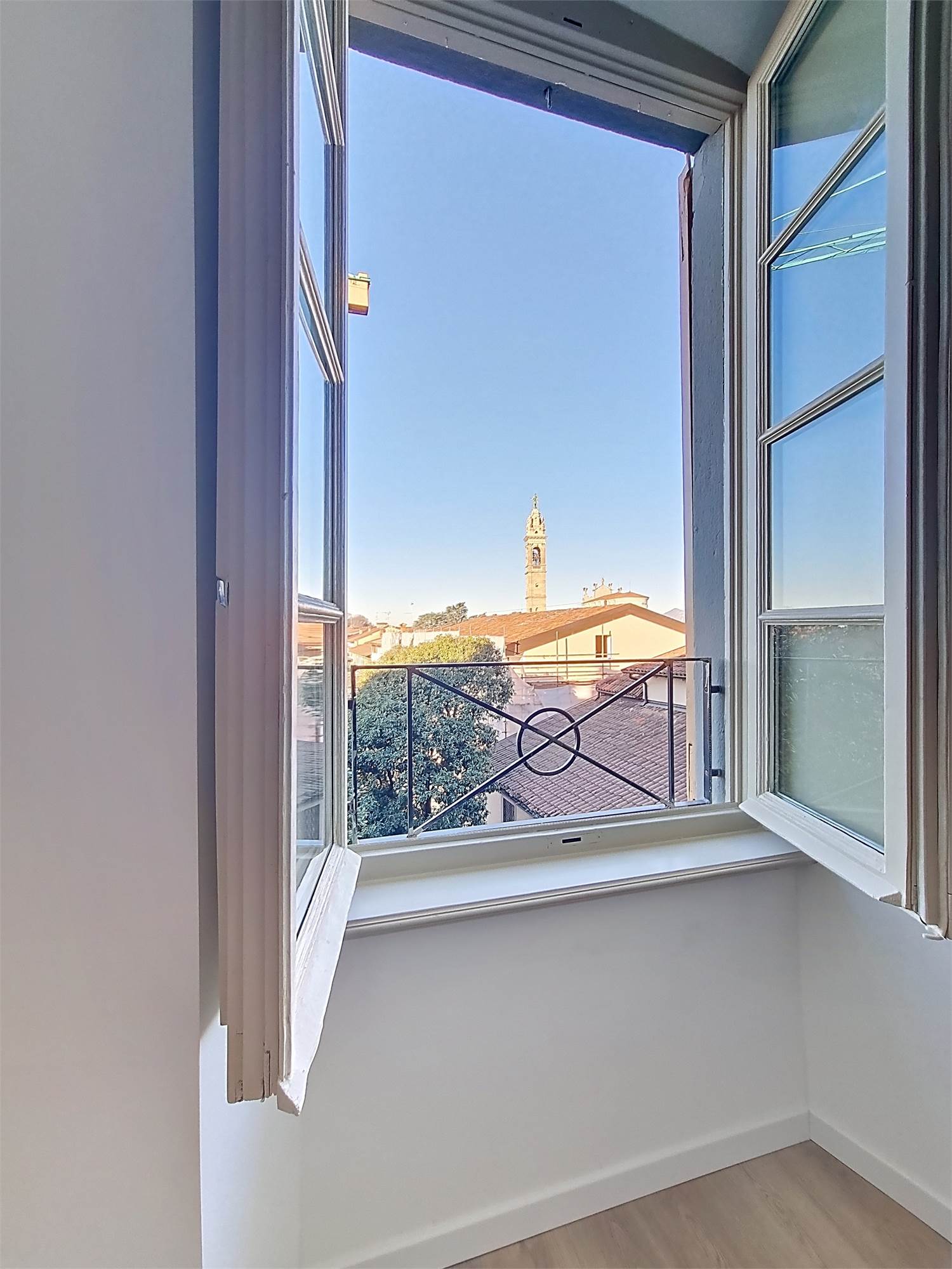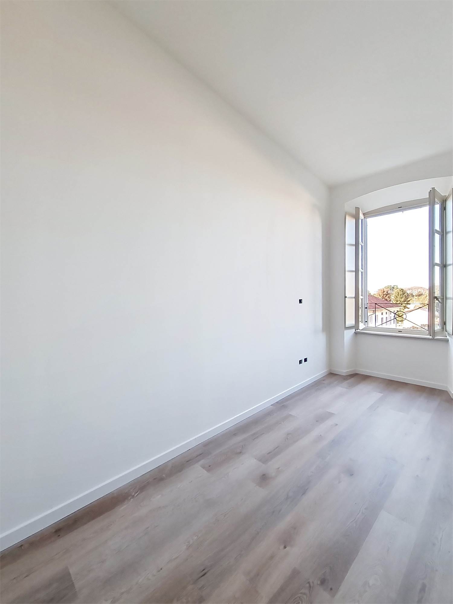 La caratteristica distintiva di questa soluzione è senza dubbio la straordinaria luminosità, unita a una vista impareggiabile sul giardino all’italiana antistante la villa. L’appartamento gode di un affaccio privilegiato sul fronte principale dell’ingresso e di suggestive finestre della cucina che si aprono sugli affreschi del salone nobiliare, creando un dialogo unico tra interni ed arte storica.