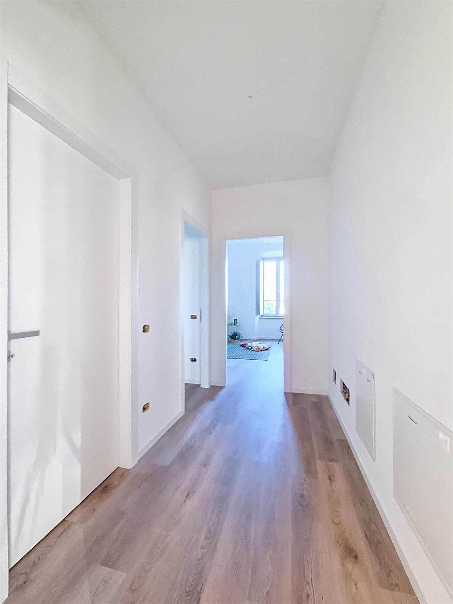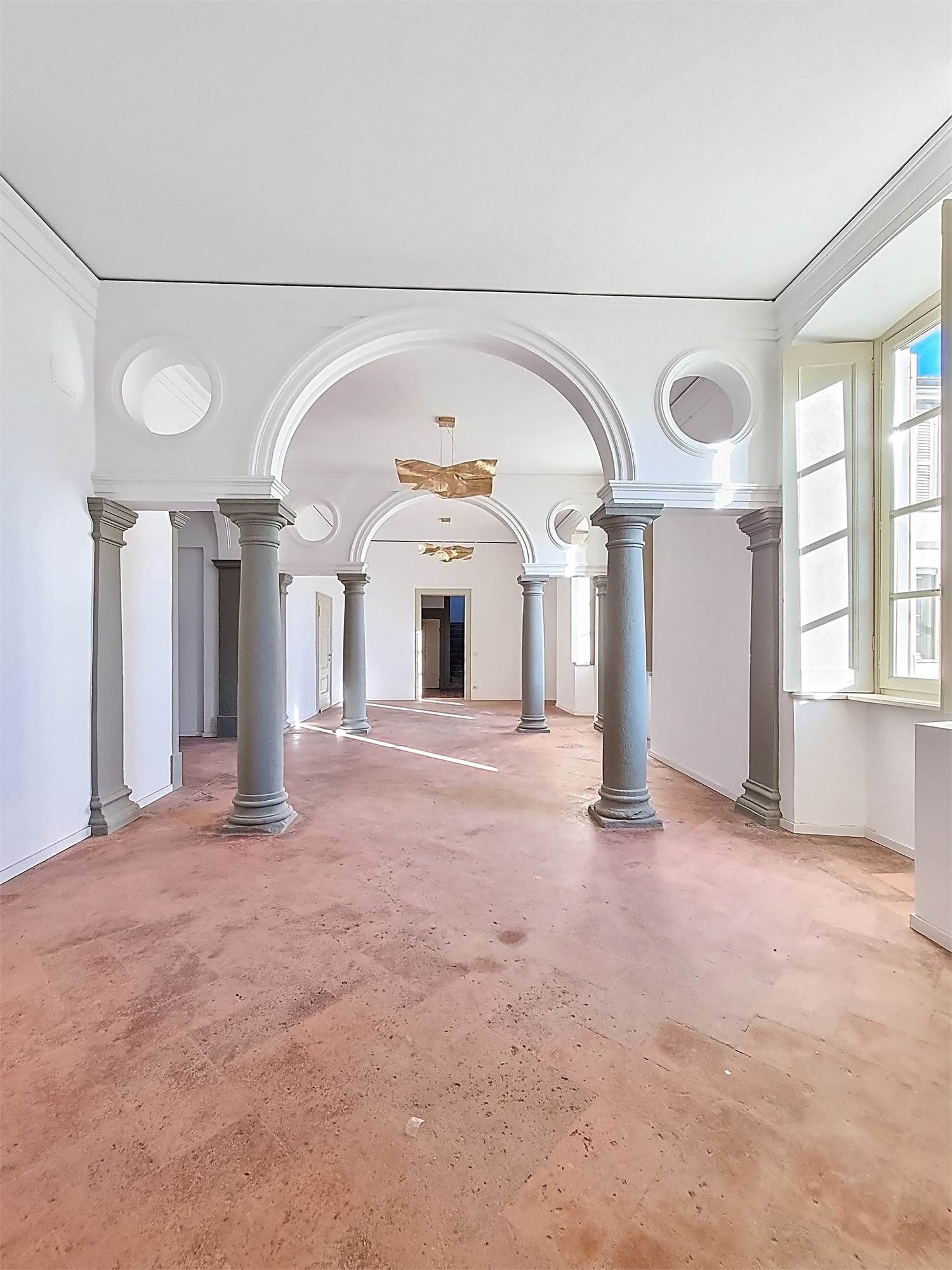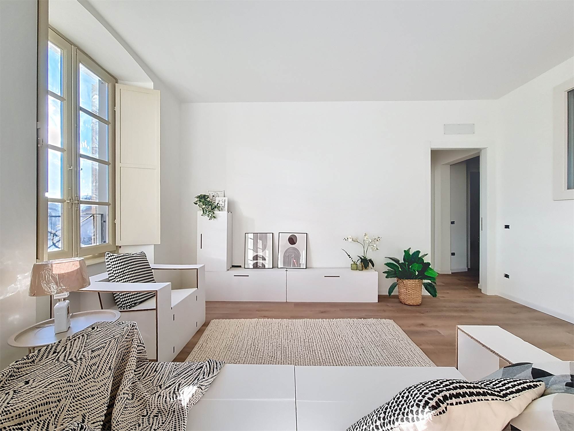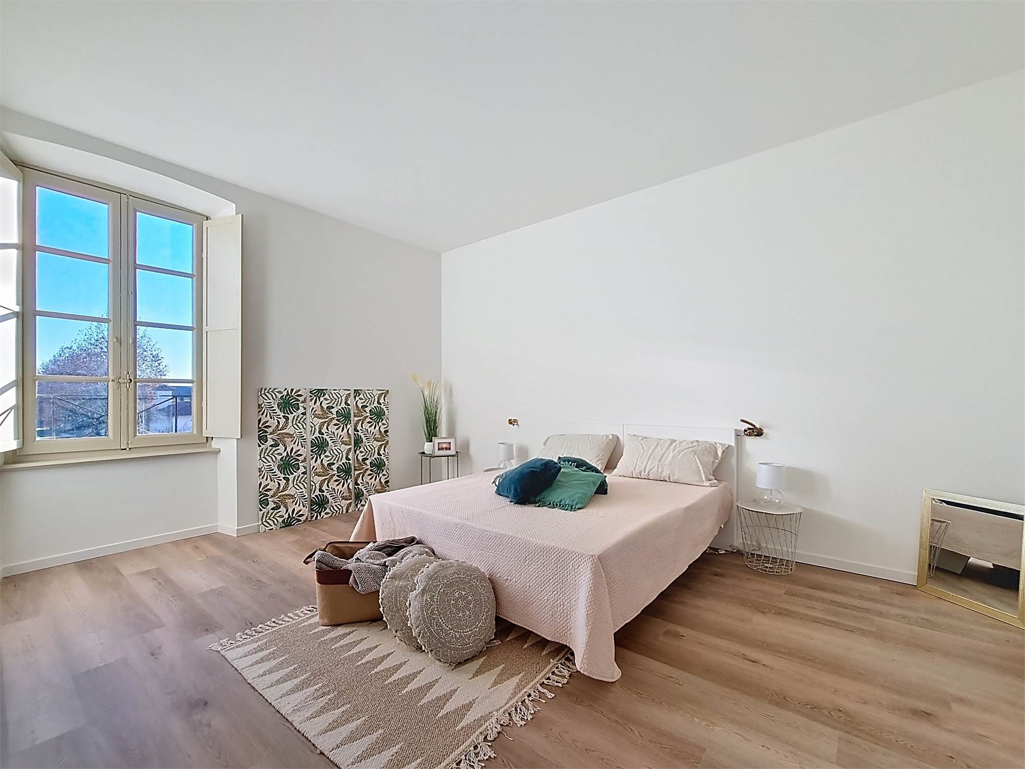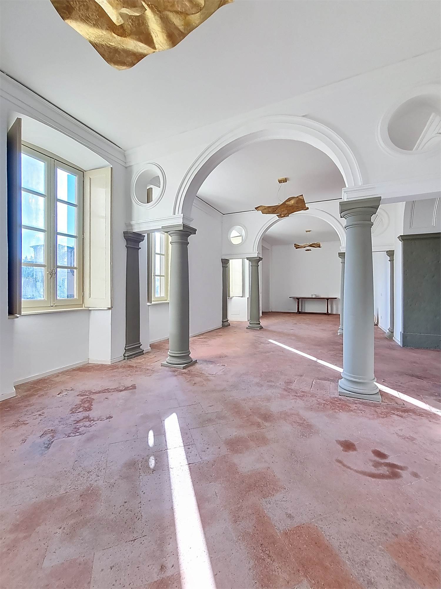La caratteristica distintiva di questa soluzione è senza dubbio la straordinaria luminosità, unita a una vista impareggiabile sul giardino all’italiana antistante la villa. L’appartamento gode di un affaccio privilegiato sul fronte principale dell’ingresso e di suggestive finestre della cucina che si aprono sugli affreschi del salone nobiliare, creando un dialogo unico tra interni ed arte storica.