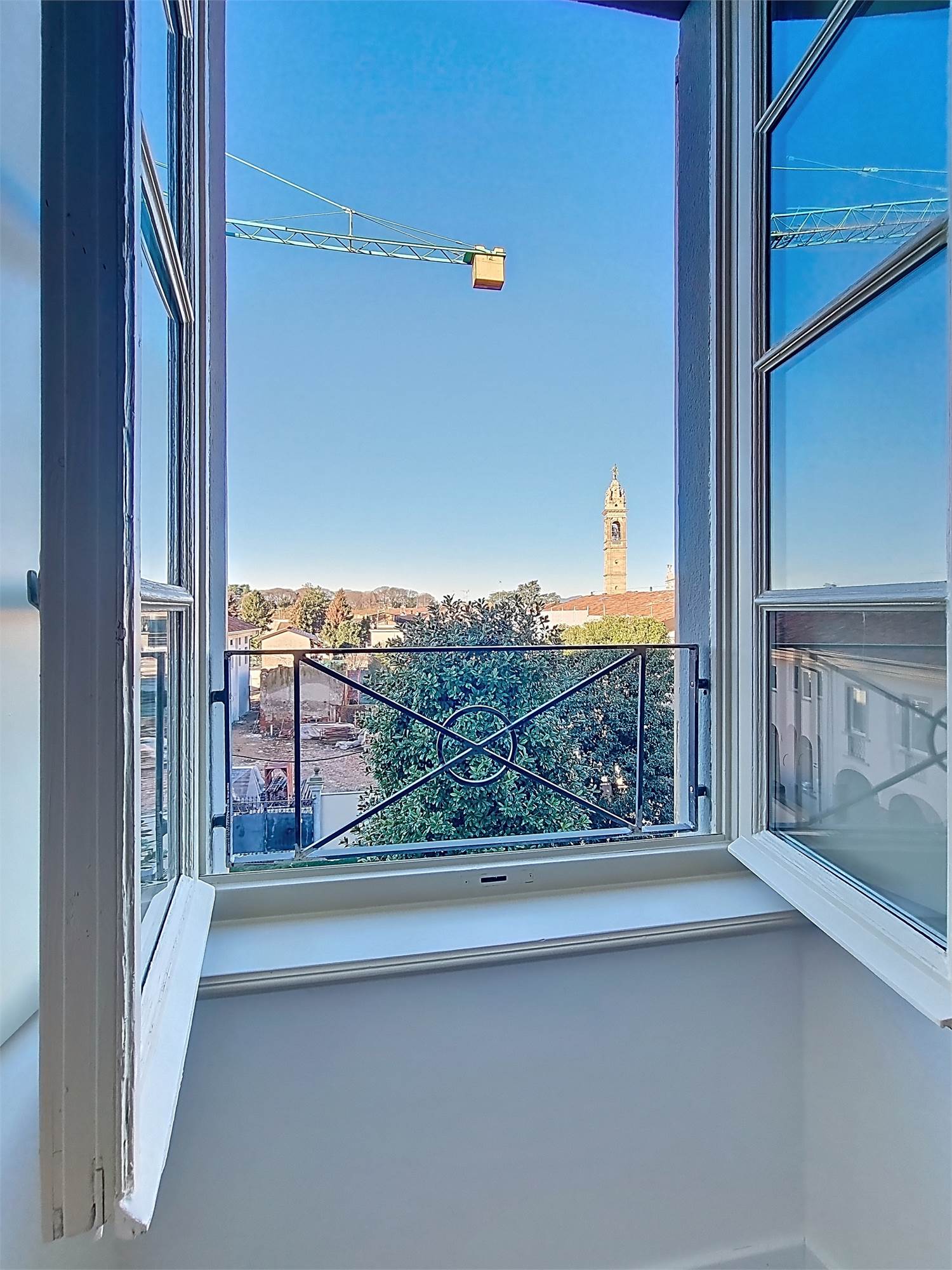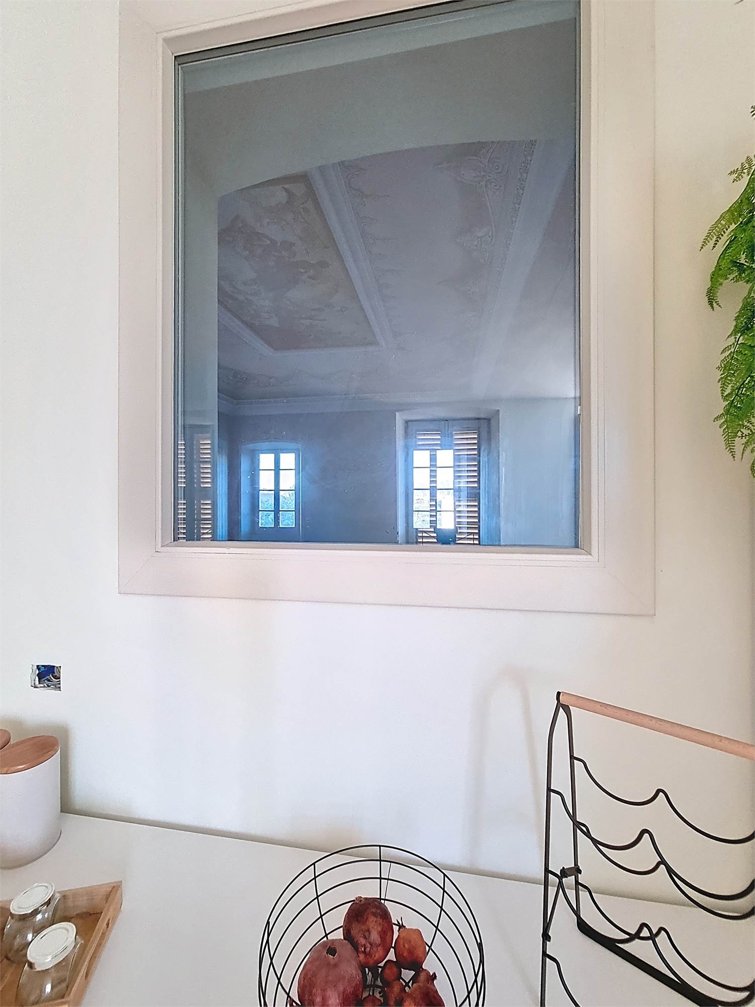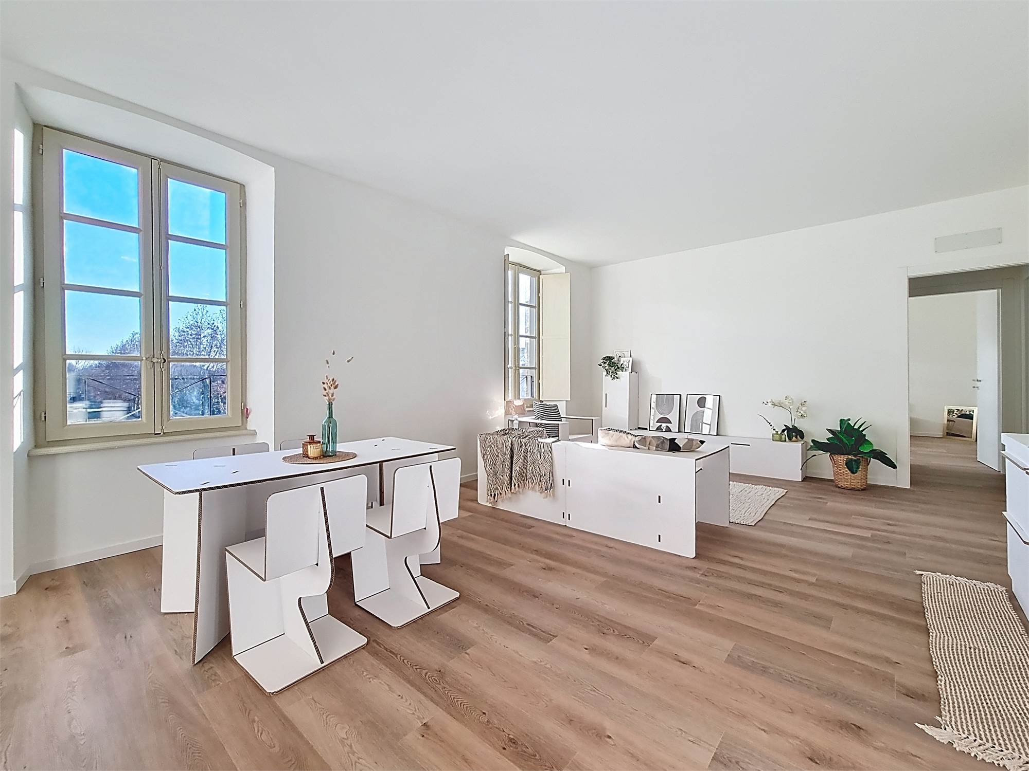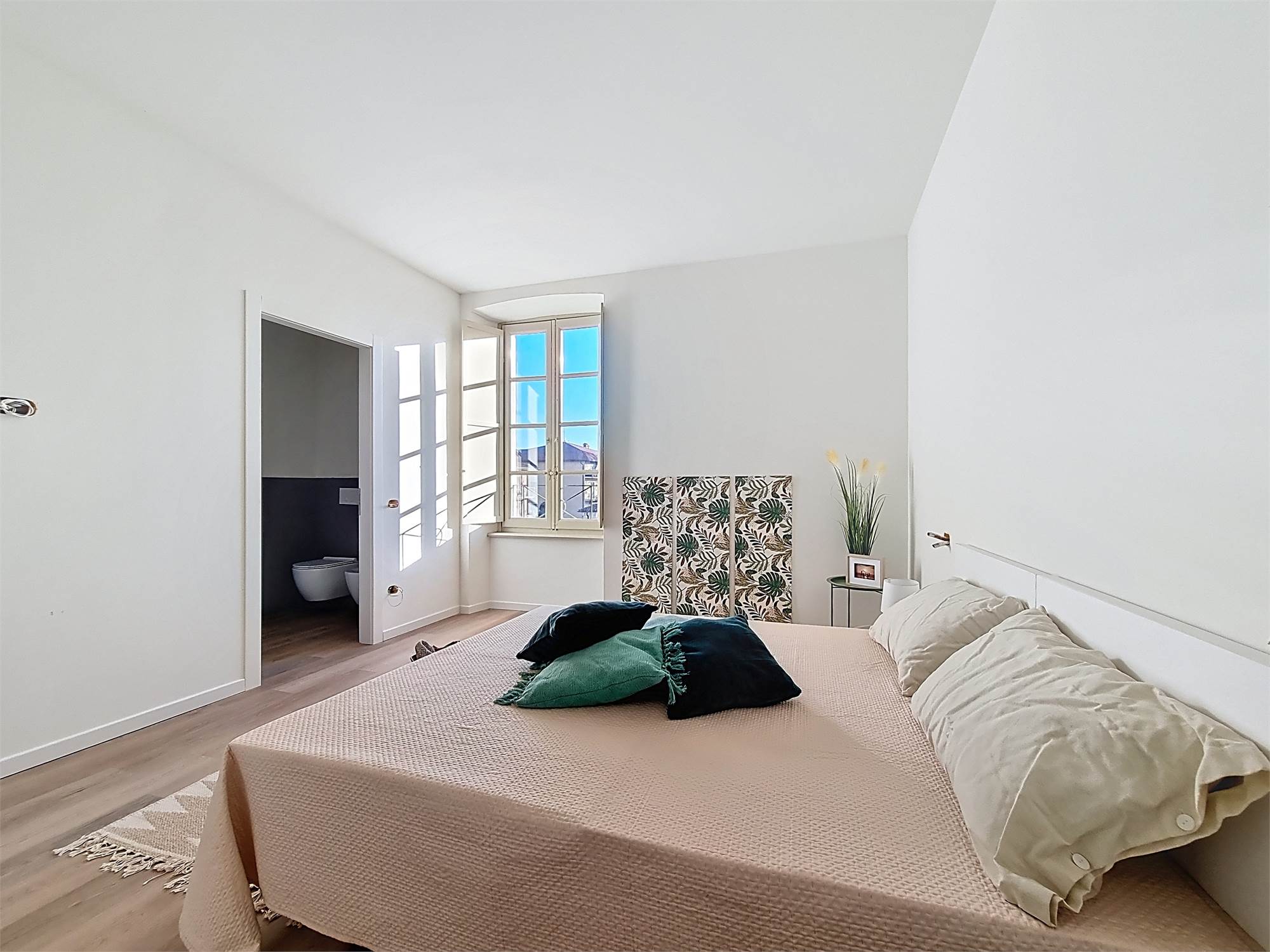 La caratteristica distintiva di questa soluzione è senza dubbio la straordinaria luminosità, unita a una vista impareggiabile sul giardino all’italiana antistante la villa. L’appartamento gode di un affaccio privilegiato sul fronte principale dell’ingresso e di suggestive finestre della cucina che si aprono sugli affreschi del salone nobiliare, creando un dialogo unico tra interni ed arte storica.