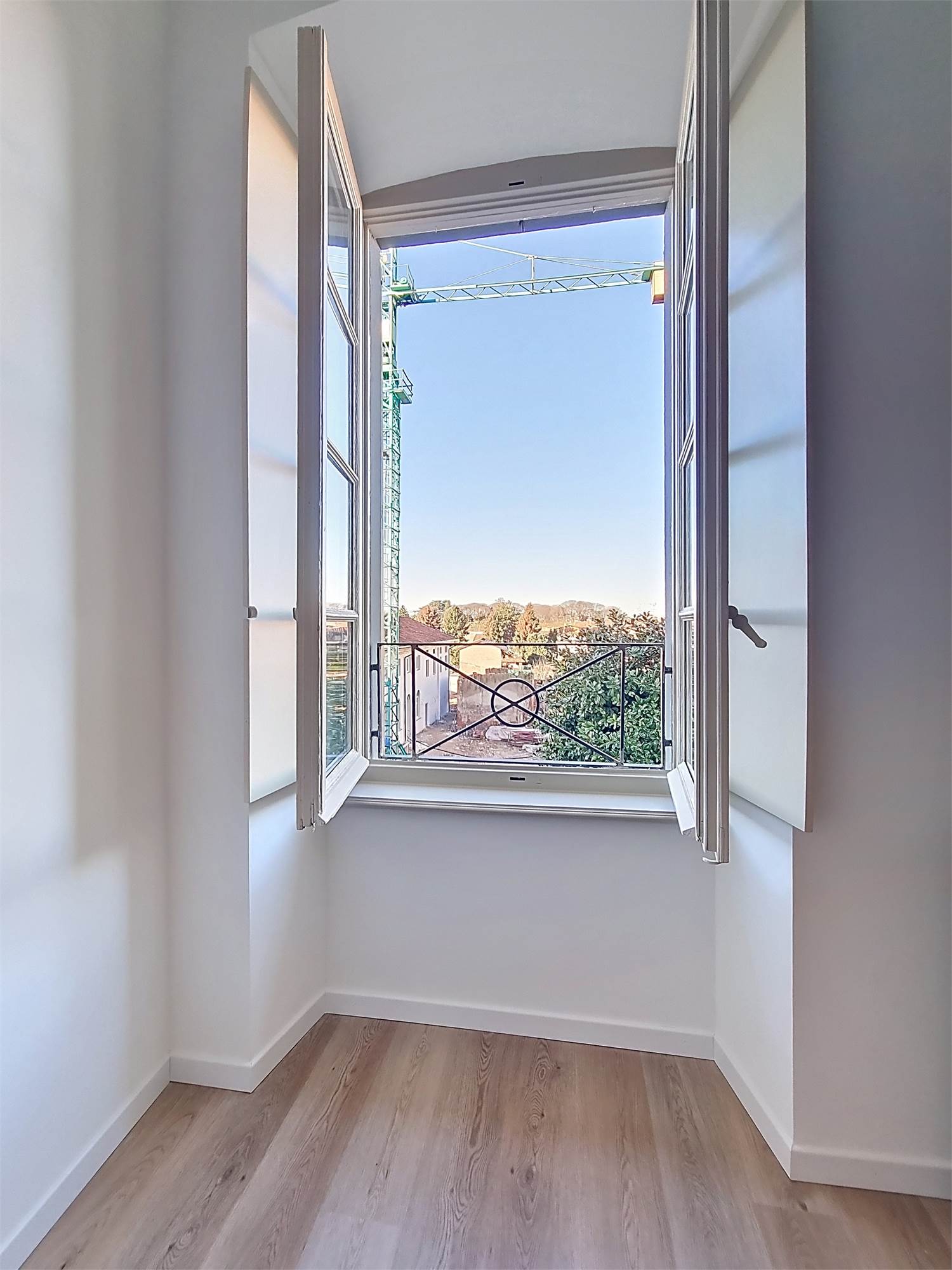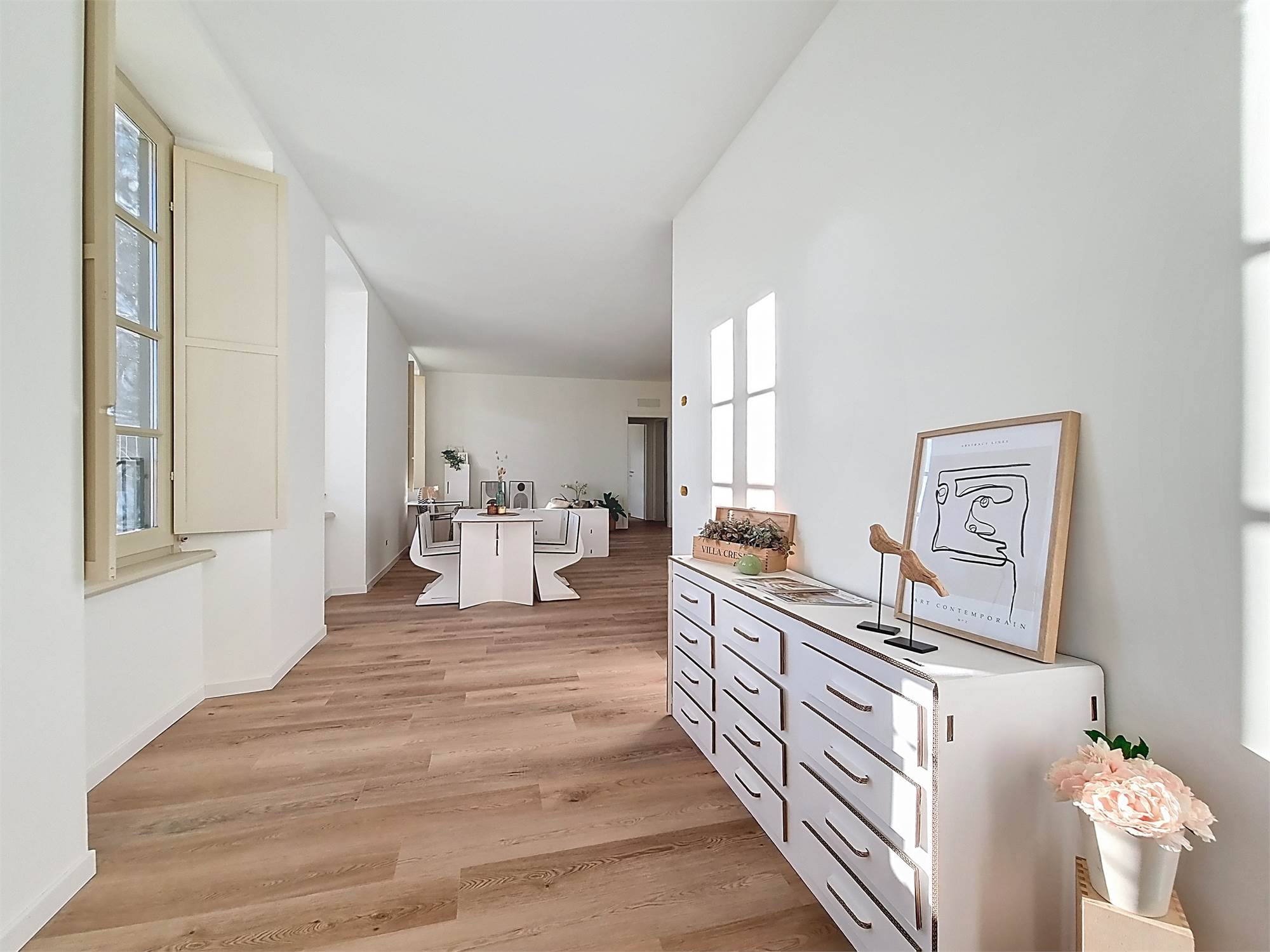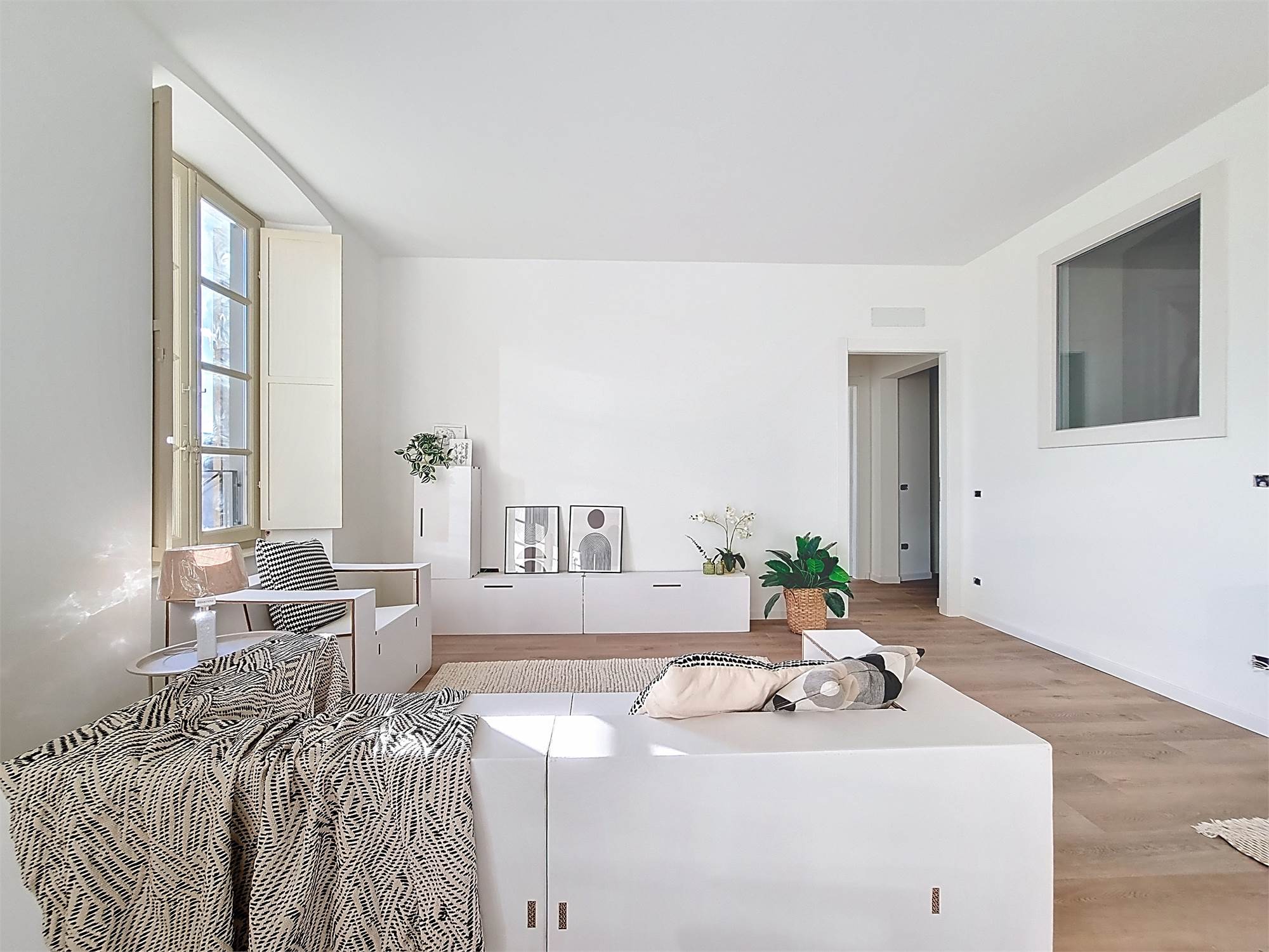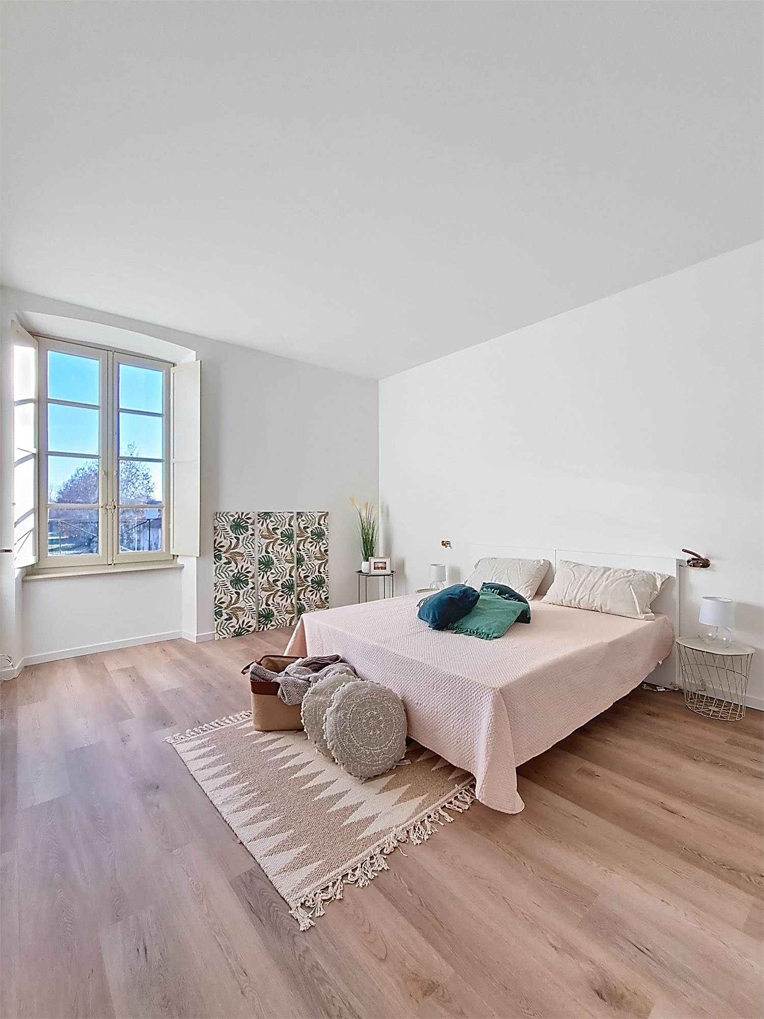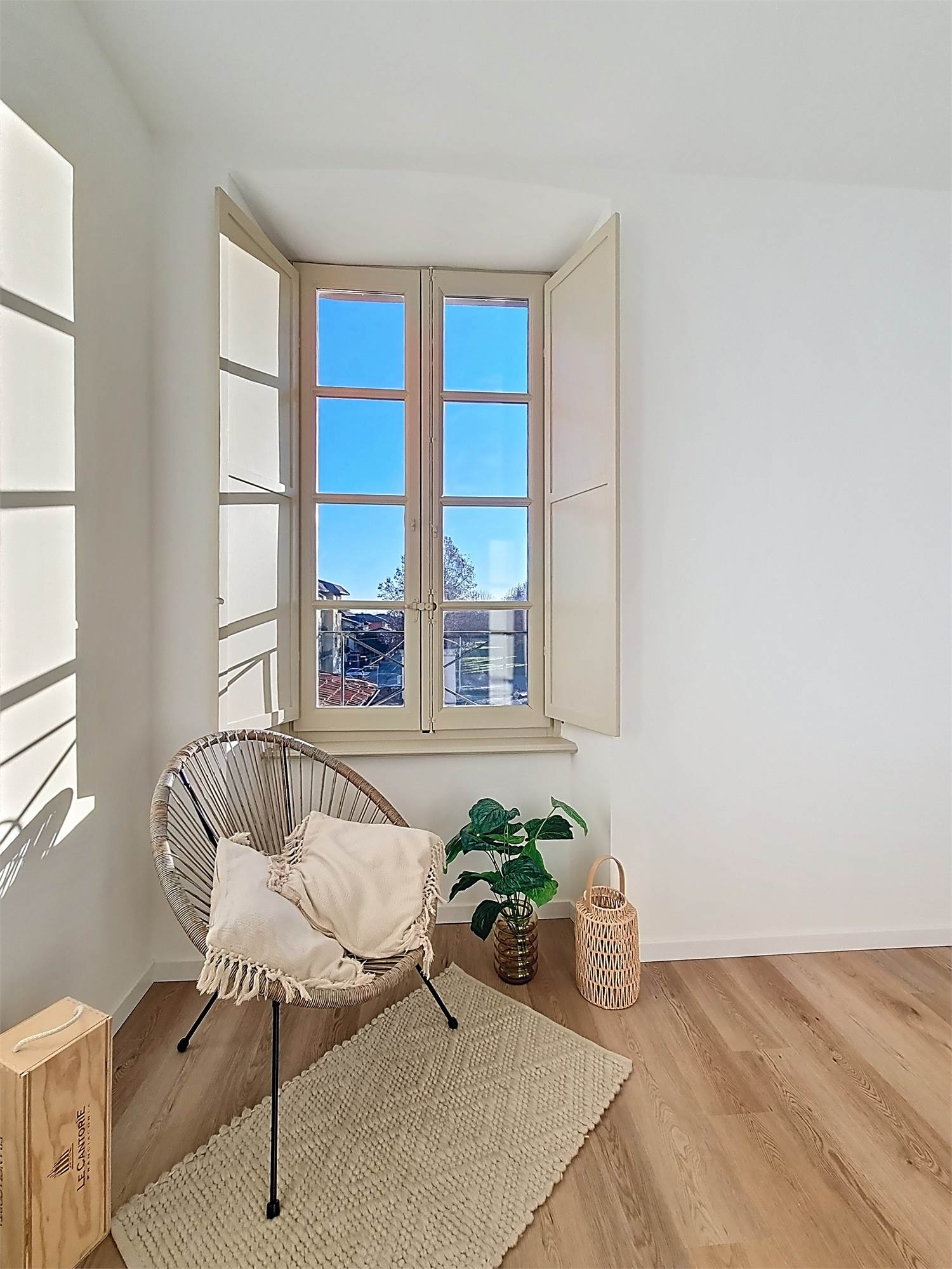 La caratteristica distintiva di questa soluzione è senza dubbio la straordinaria luminosità, unita a una vista impareggiabile sul giardino all’italiana antistante la villa. L’appartamento gode di un affaccio privilegiato sul fronte principale dell’ingresso e di suggestive finestre della cucina che si aprono sugli affreschi del salone nobiliare, creando un dialogo unico tra interni ed arte storica.