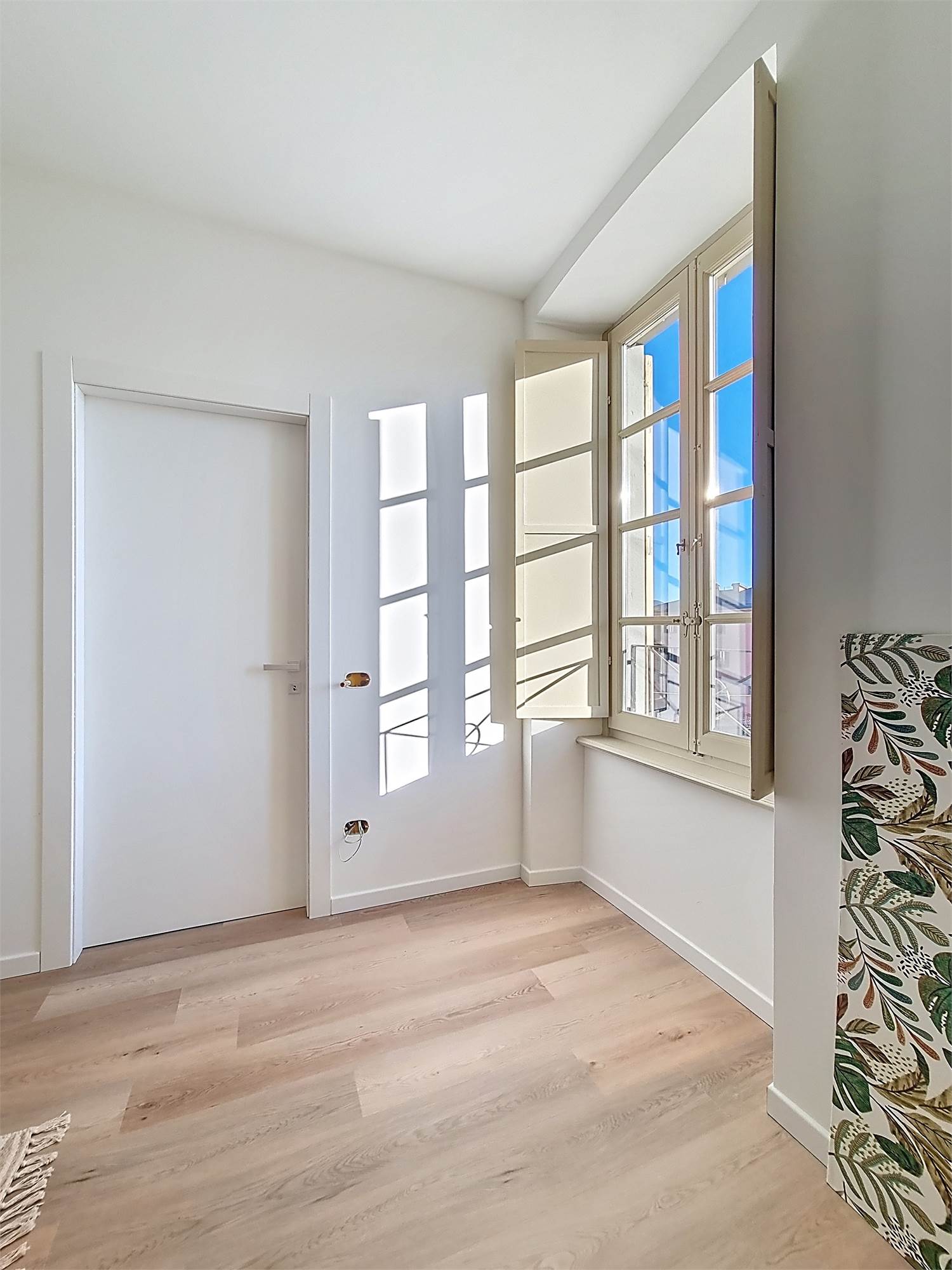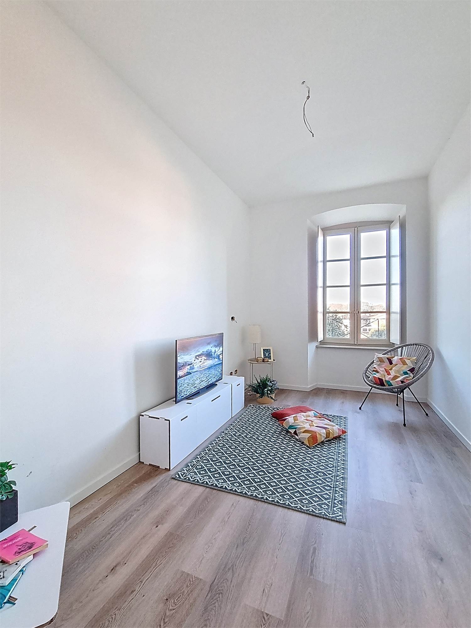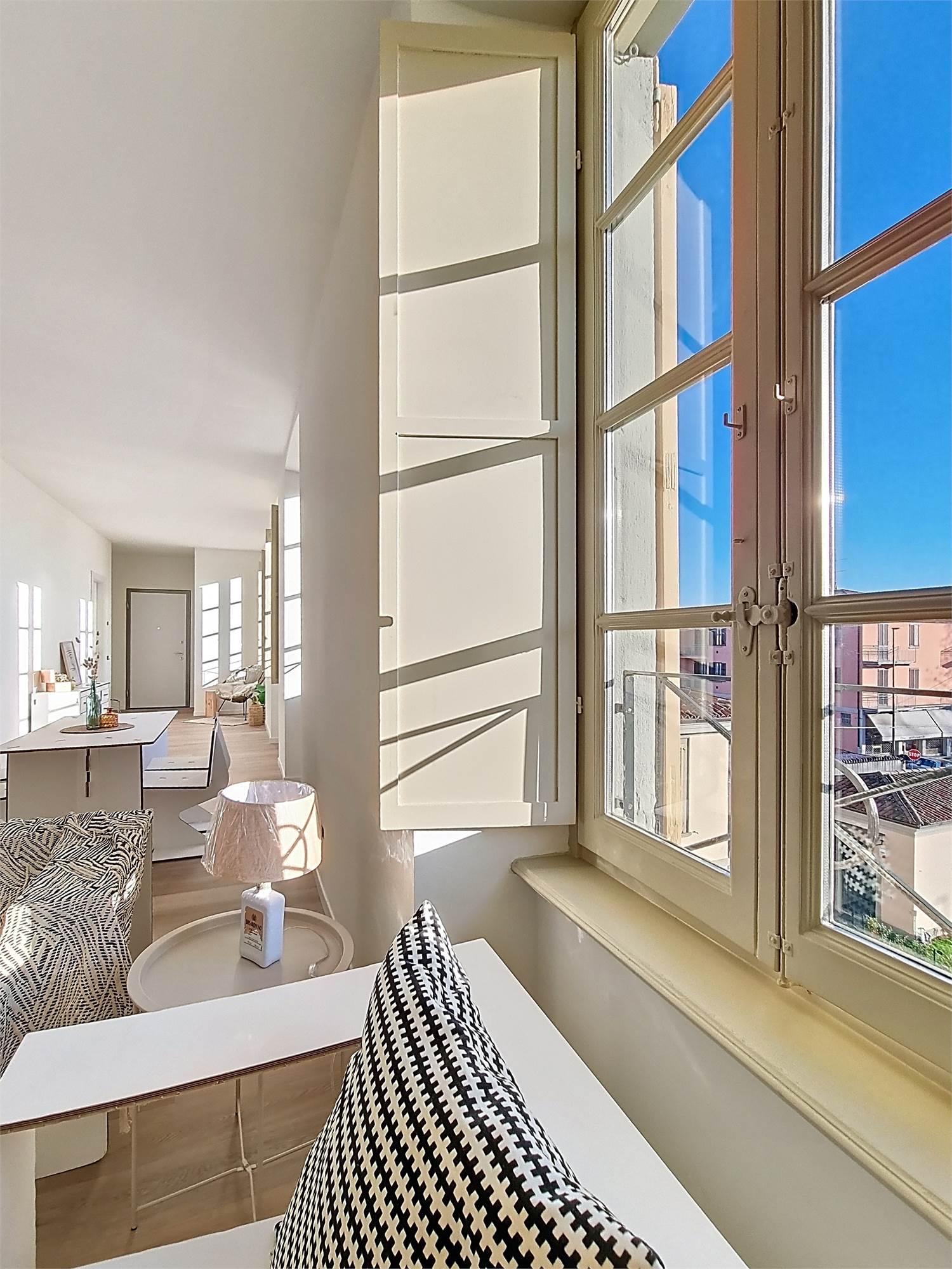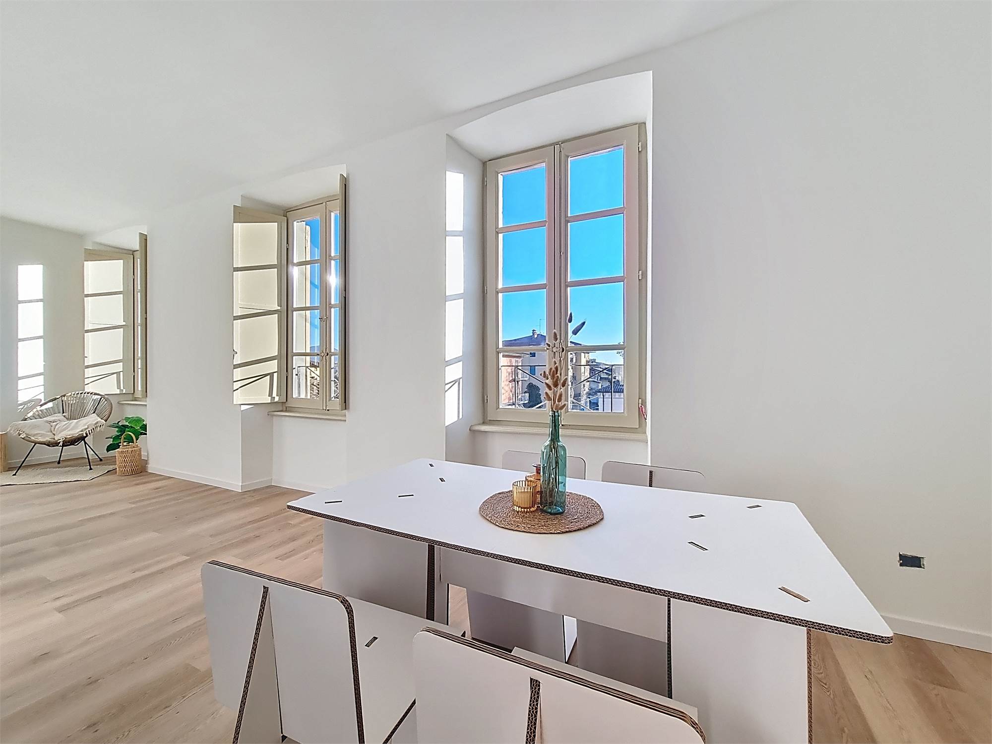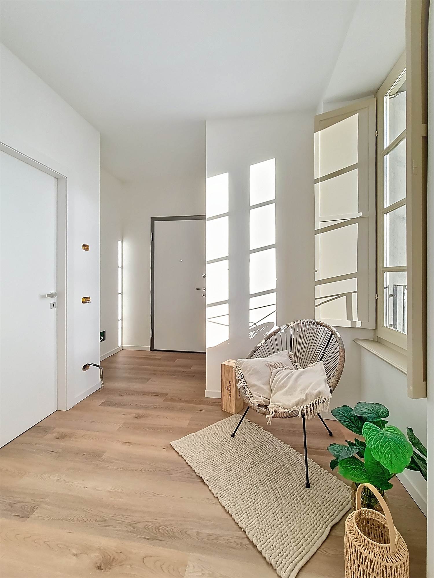 La caratteristica distintiva di questa soluzione è senza dubbio la straordinaria luminosità, unita a una vista impareggiabile sul giardino all’italiana antistante la villa. L’appartamento gode di un affaccio privilegiato sul fronte principale dell’ingresso e di suggestive finestre della cucina che si aprono sugli affreschi del salone nobiliare, creando un dialogo unico tra interni ed arte storica.