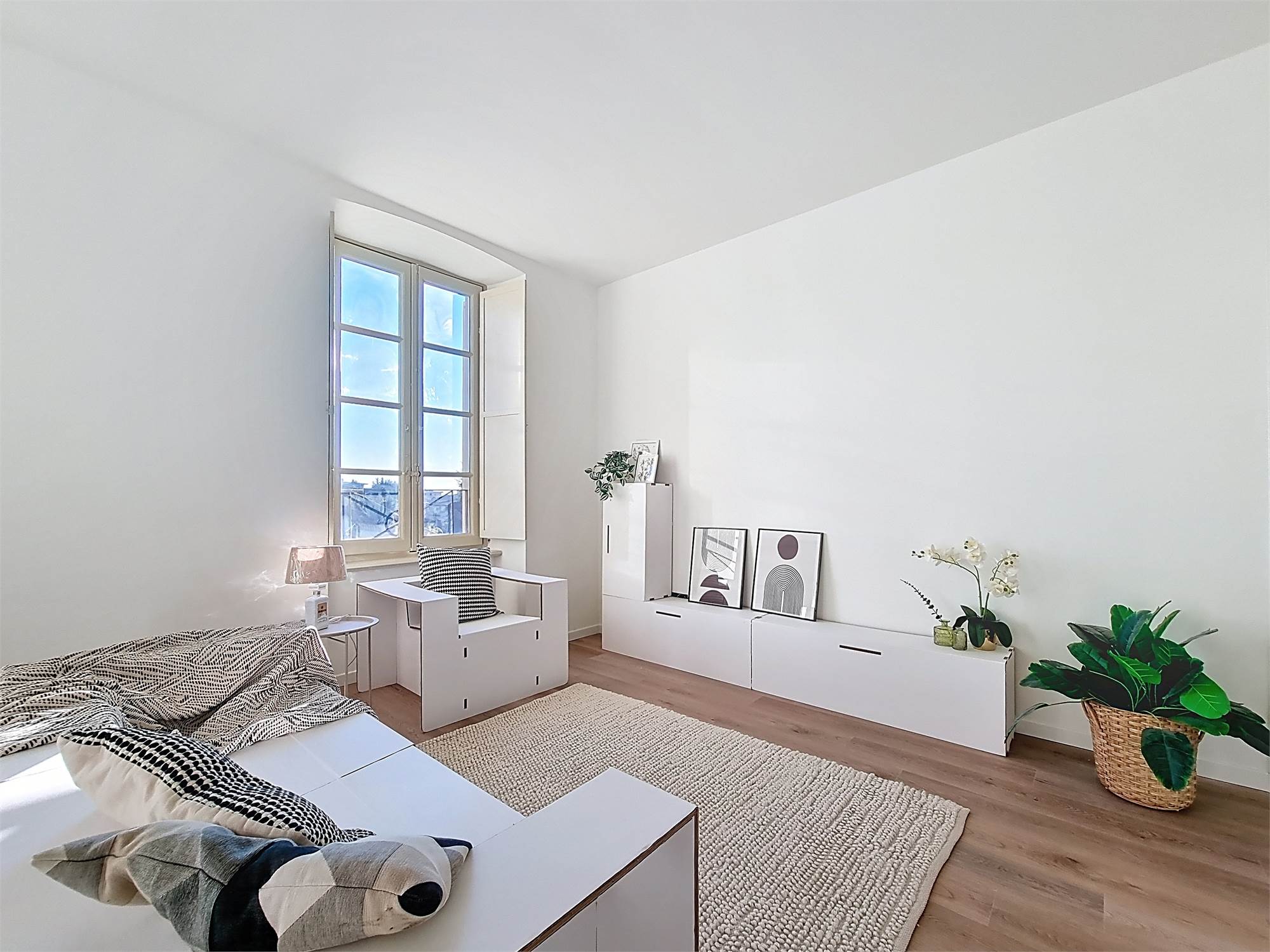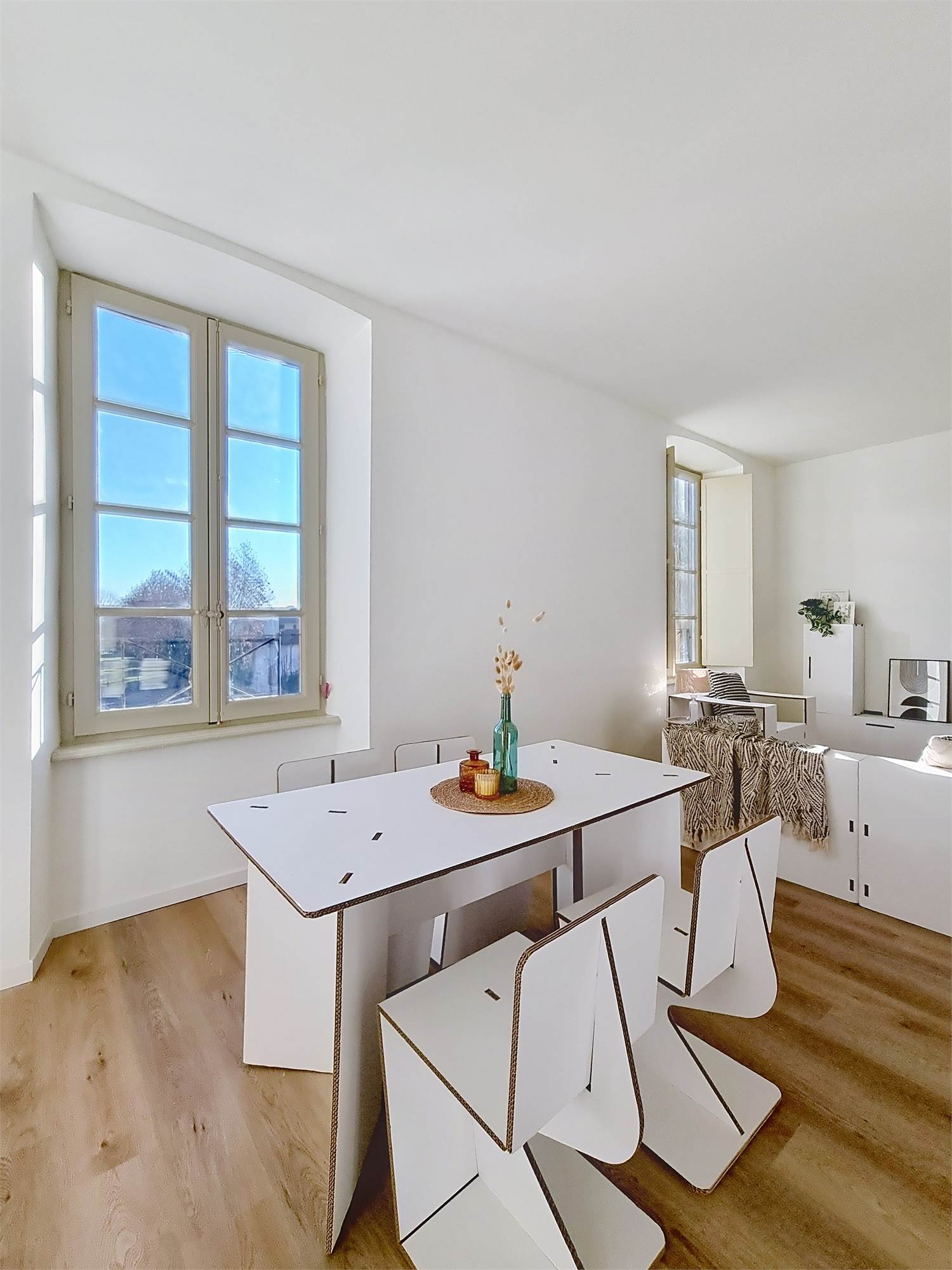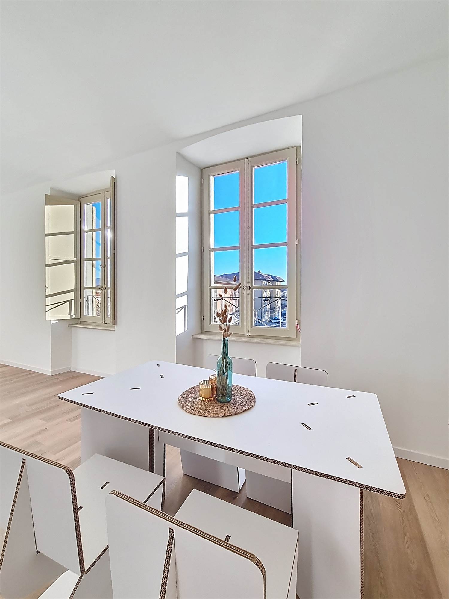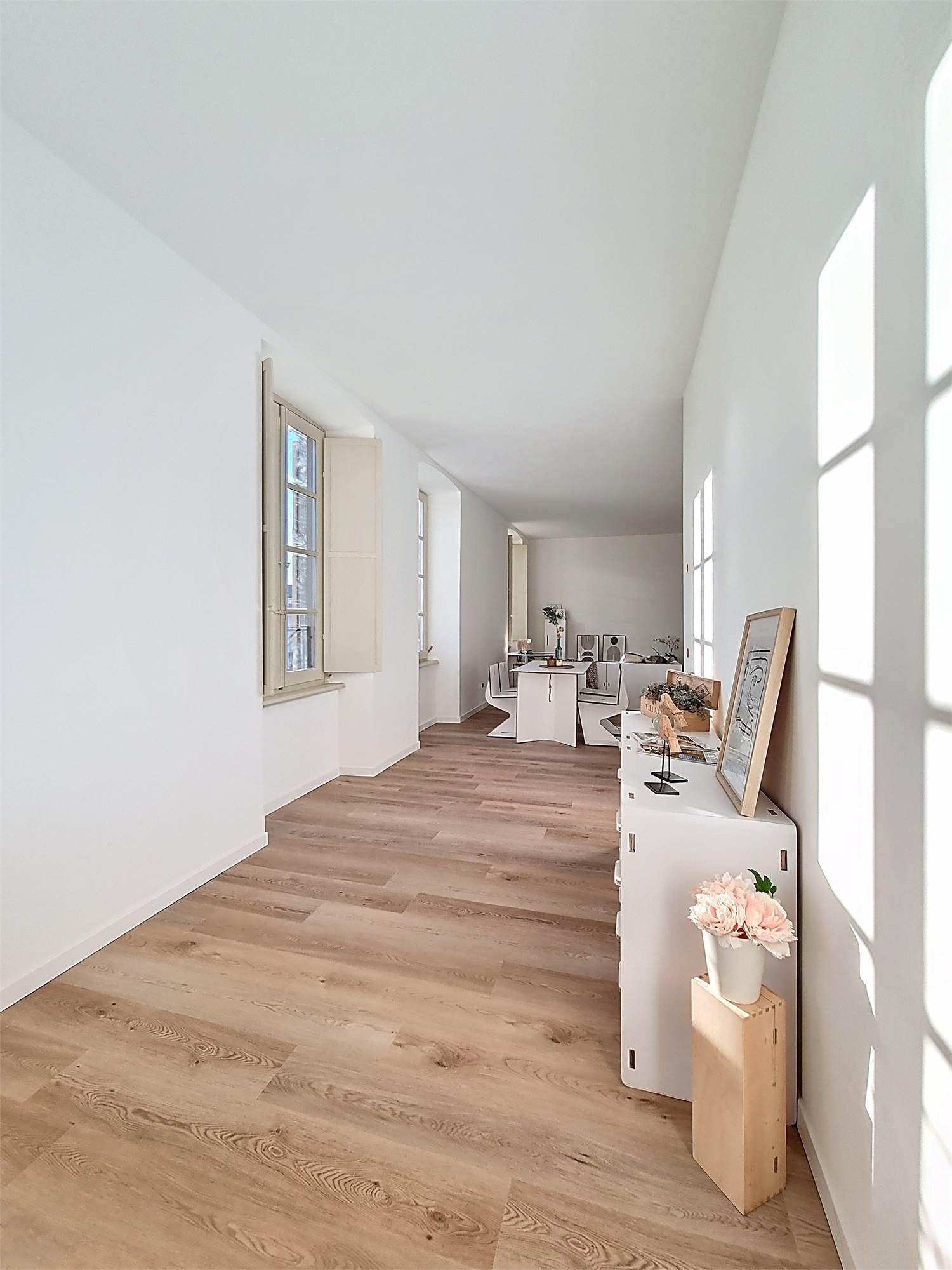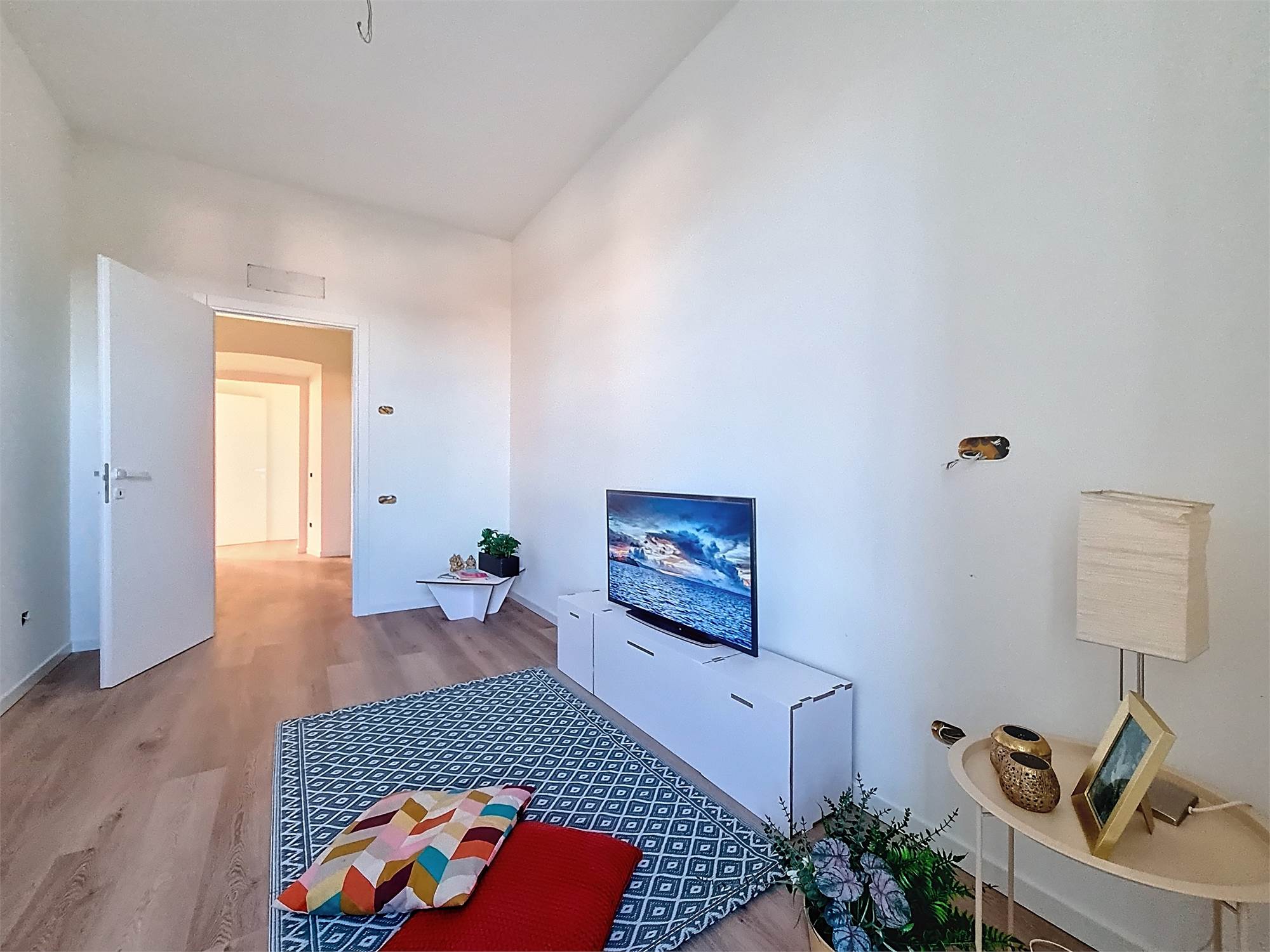 La caratteristica distintiva di questa soluzione è senza dubbio la straordinaria luminosità, unita a una vista impareggiabile sul giardino all’italiana antistante la villa. L’appartamento gode di un affaccio privilegiato sul fronte principale dell’ingresso e di suggestive finestre della cucina che si aprono sugli affreschi del salone nobiliare, creando un dialogo unico tra interni ed arte storica.