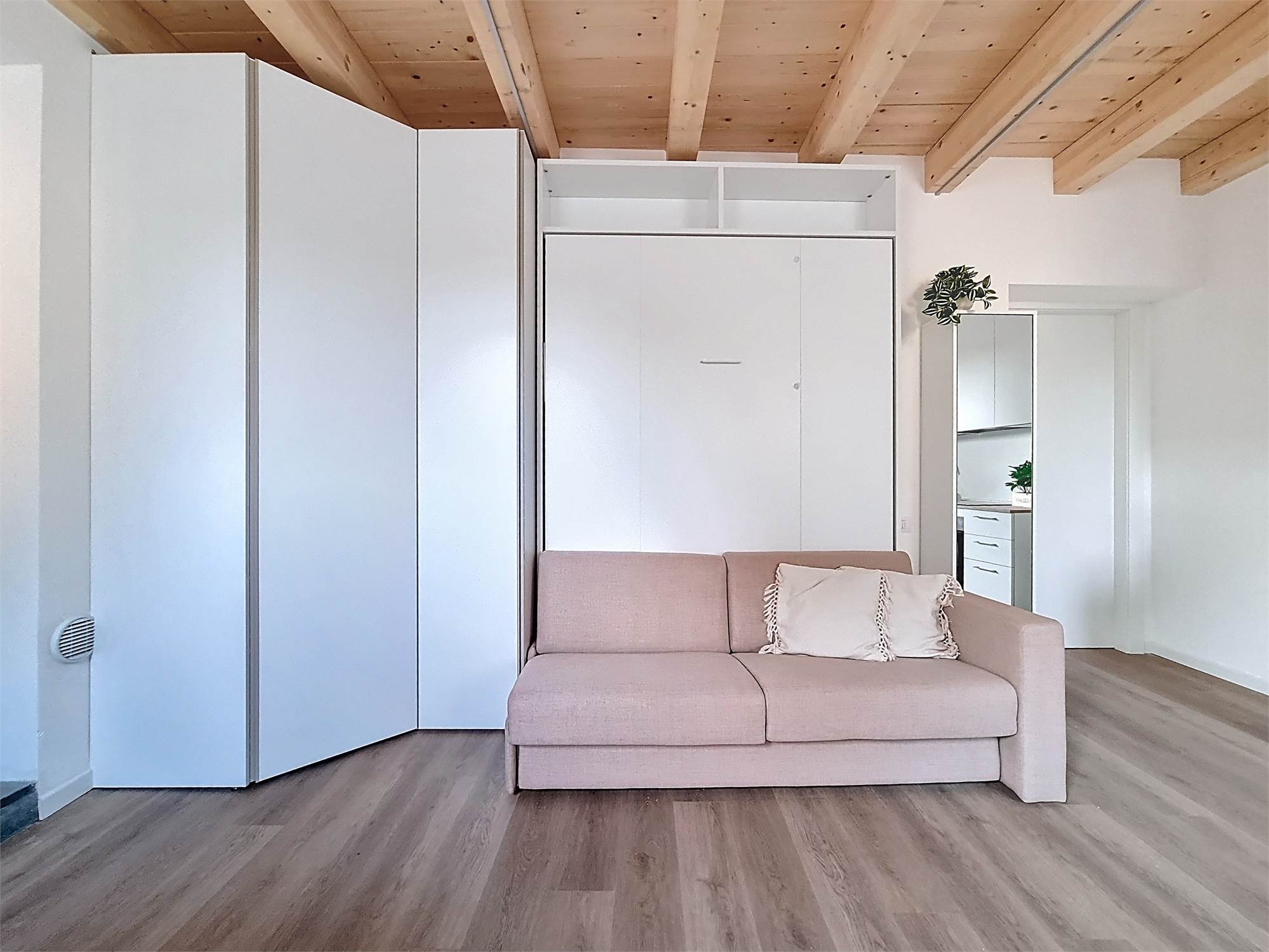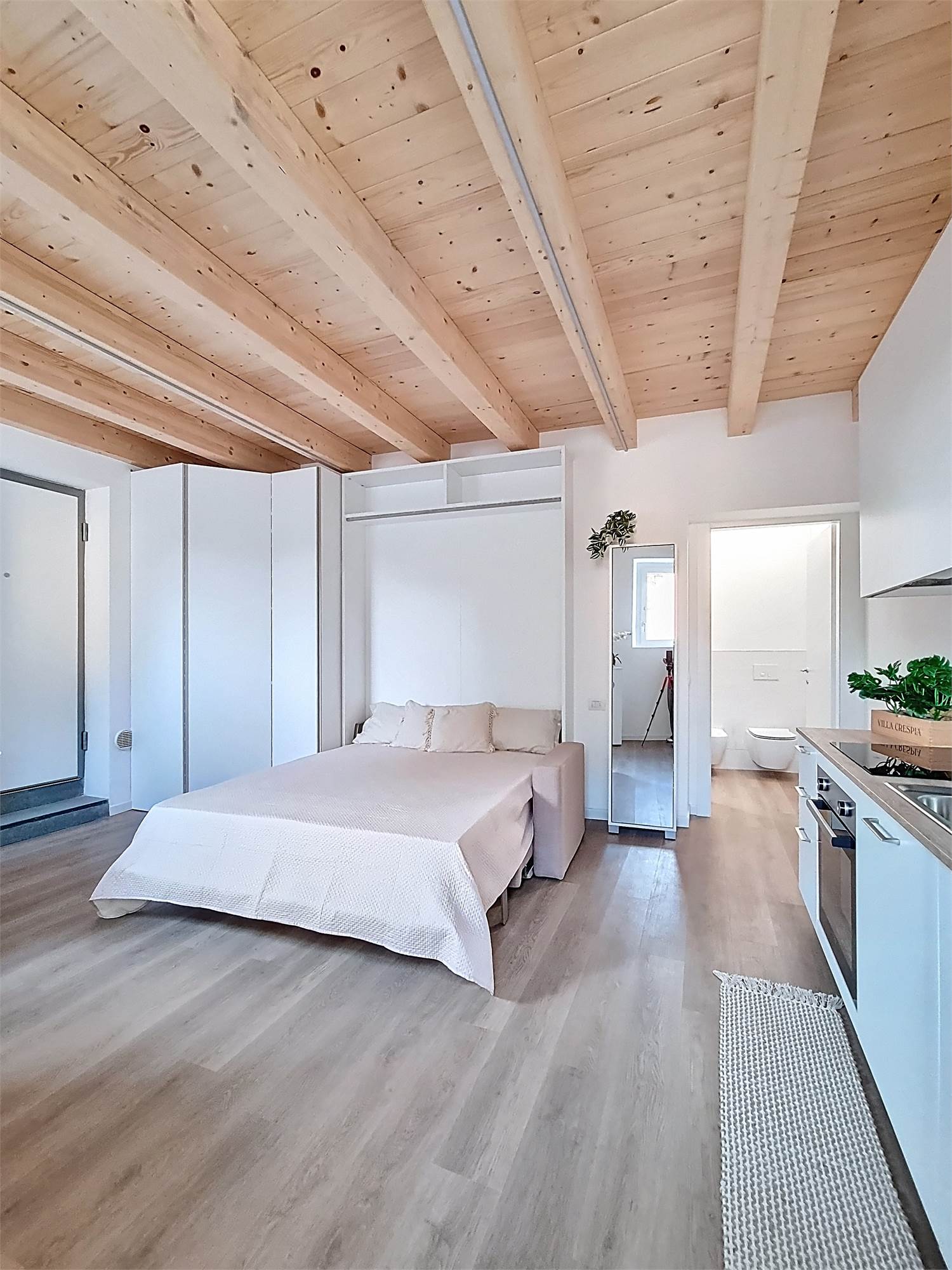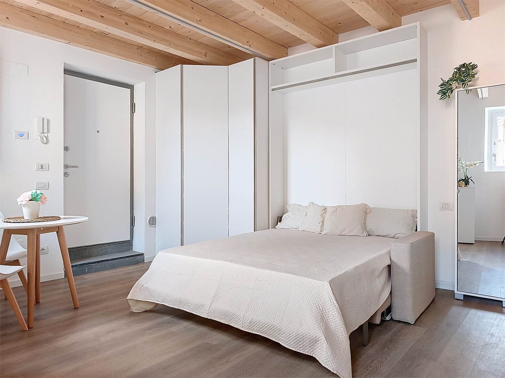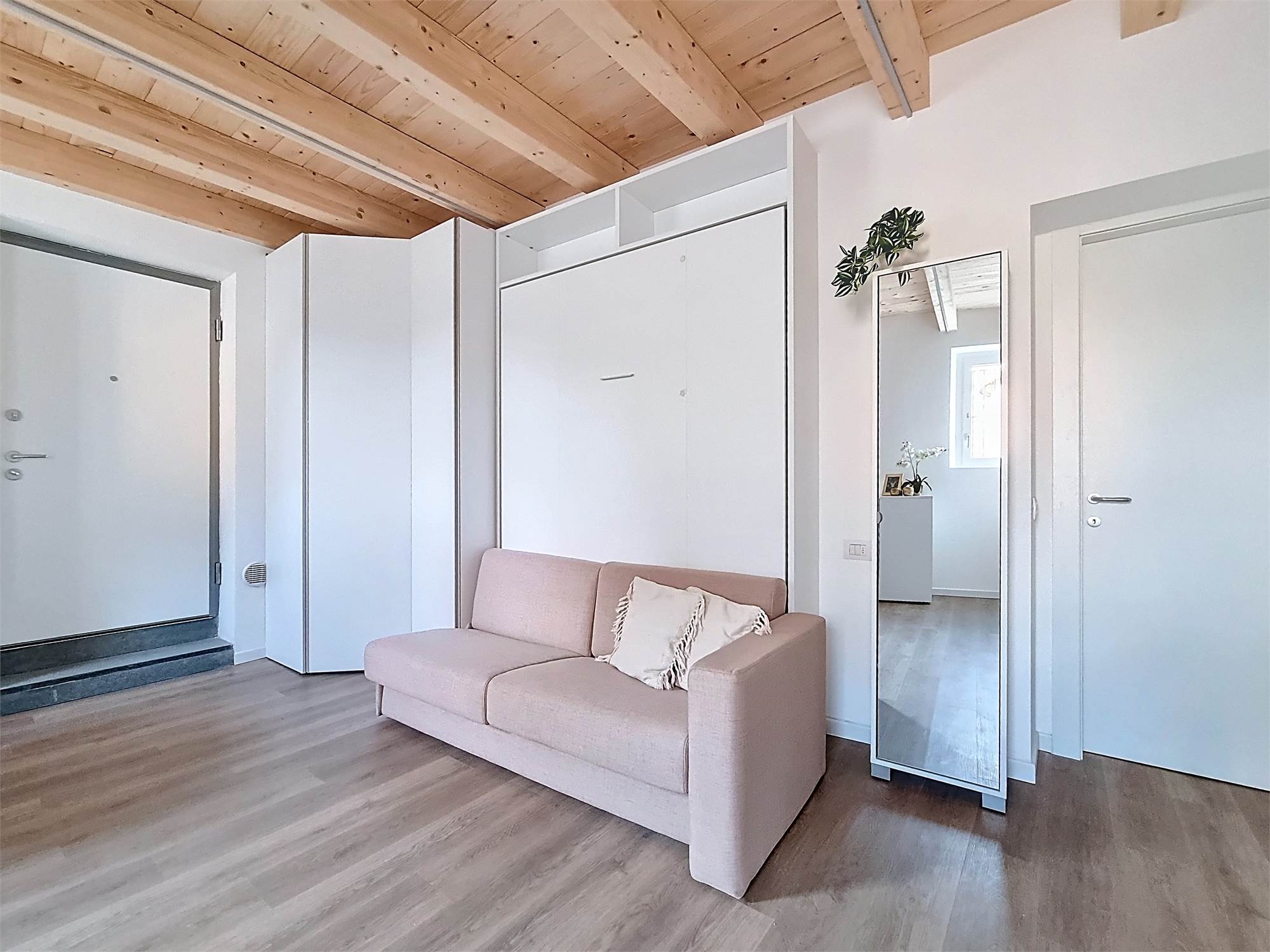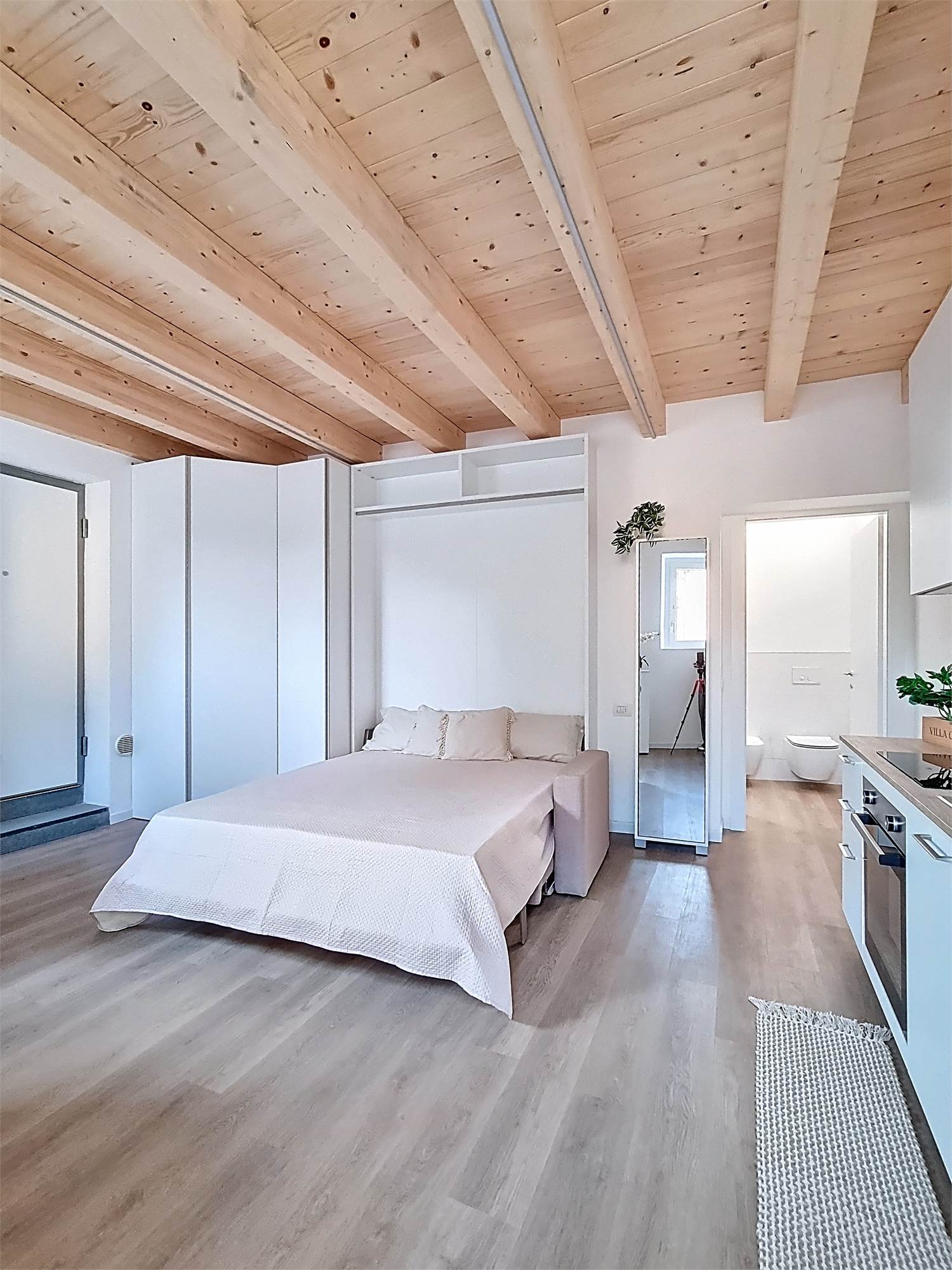 Il monolocale è completamente arredato su misura: dispone di ampia cucina completa di elettrodomestici, mobile divano letto ribaltabile, capiente cabina armadio, credenza, stoviglie e bagno finestrato con doccia e sanitari sospesi, molto spazioso con angolo lavatrice.