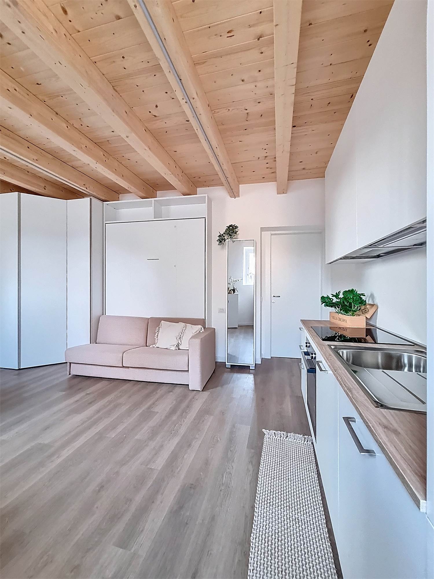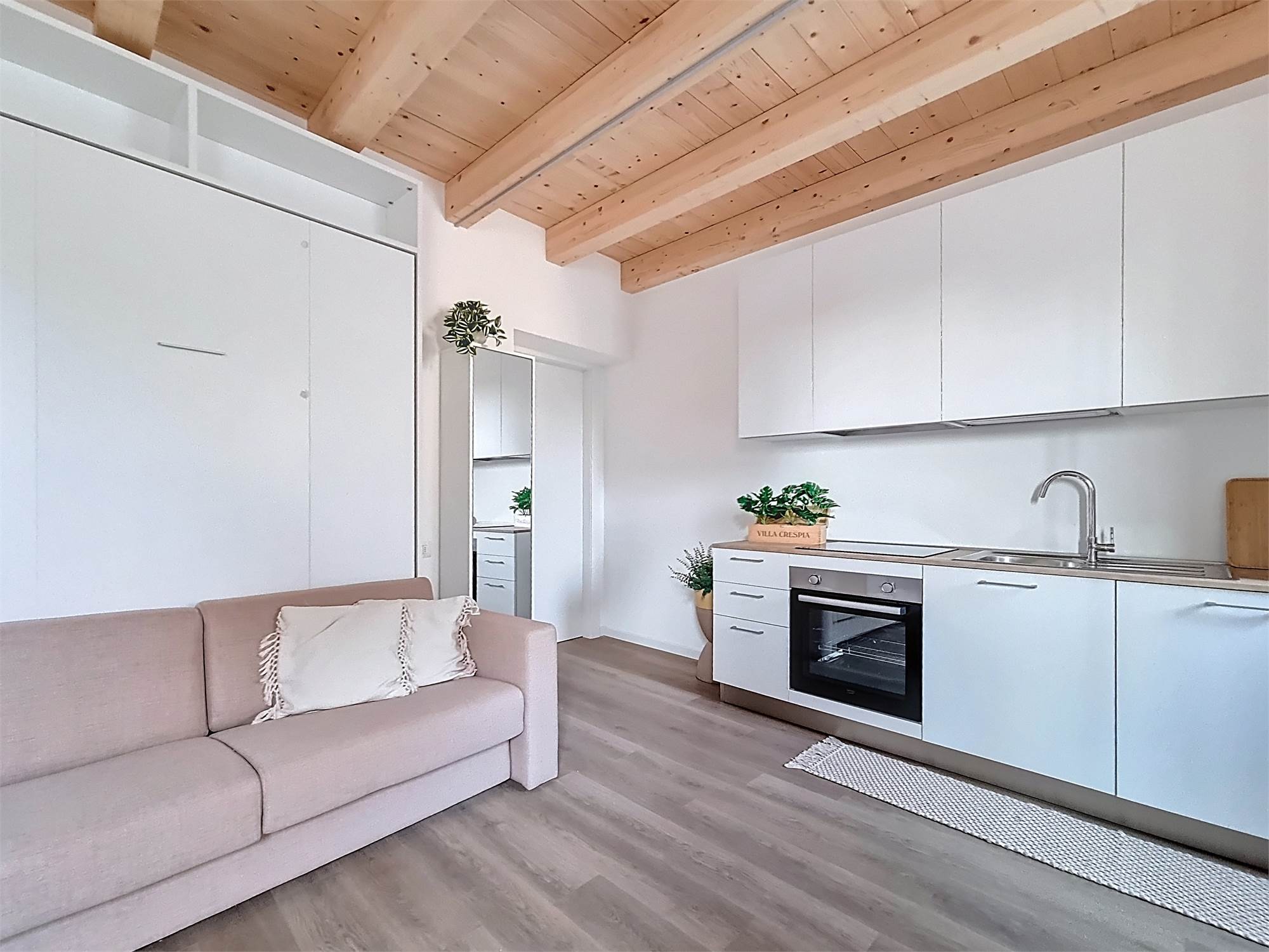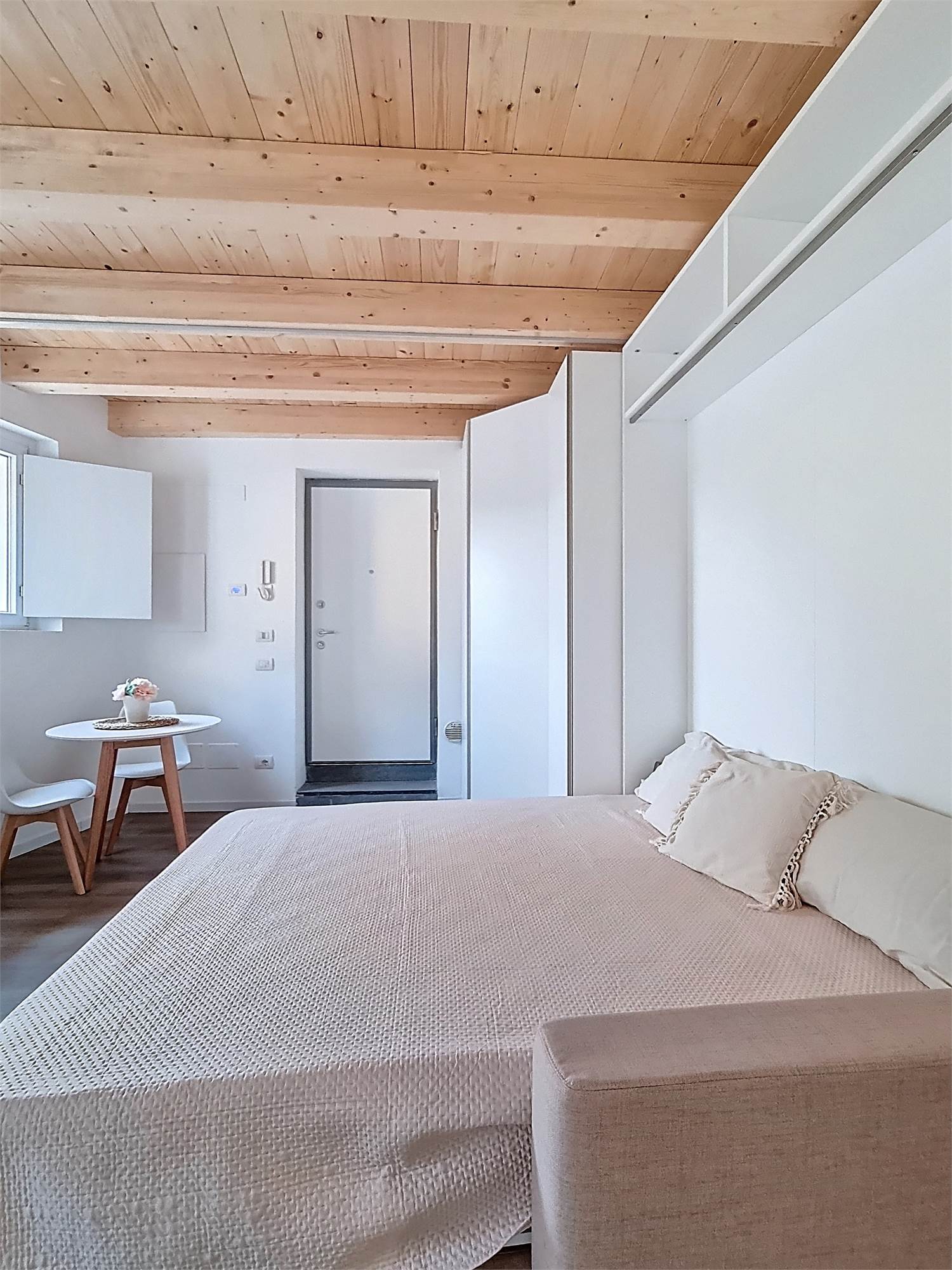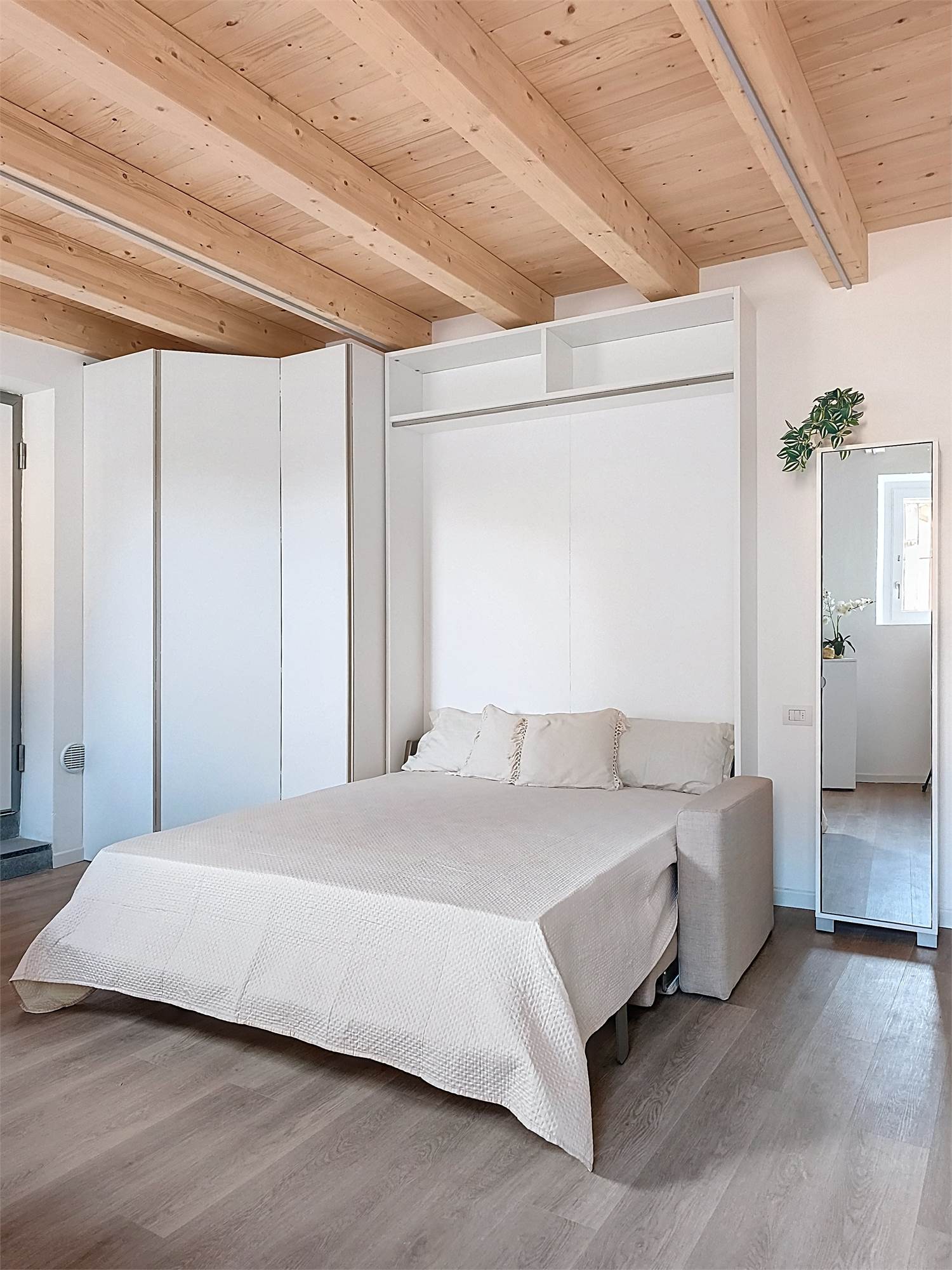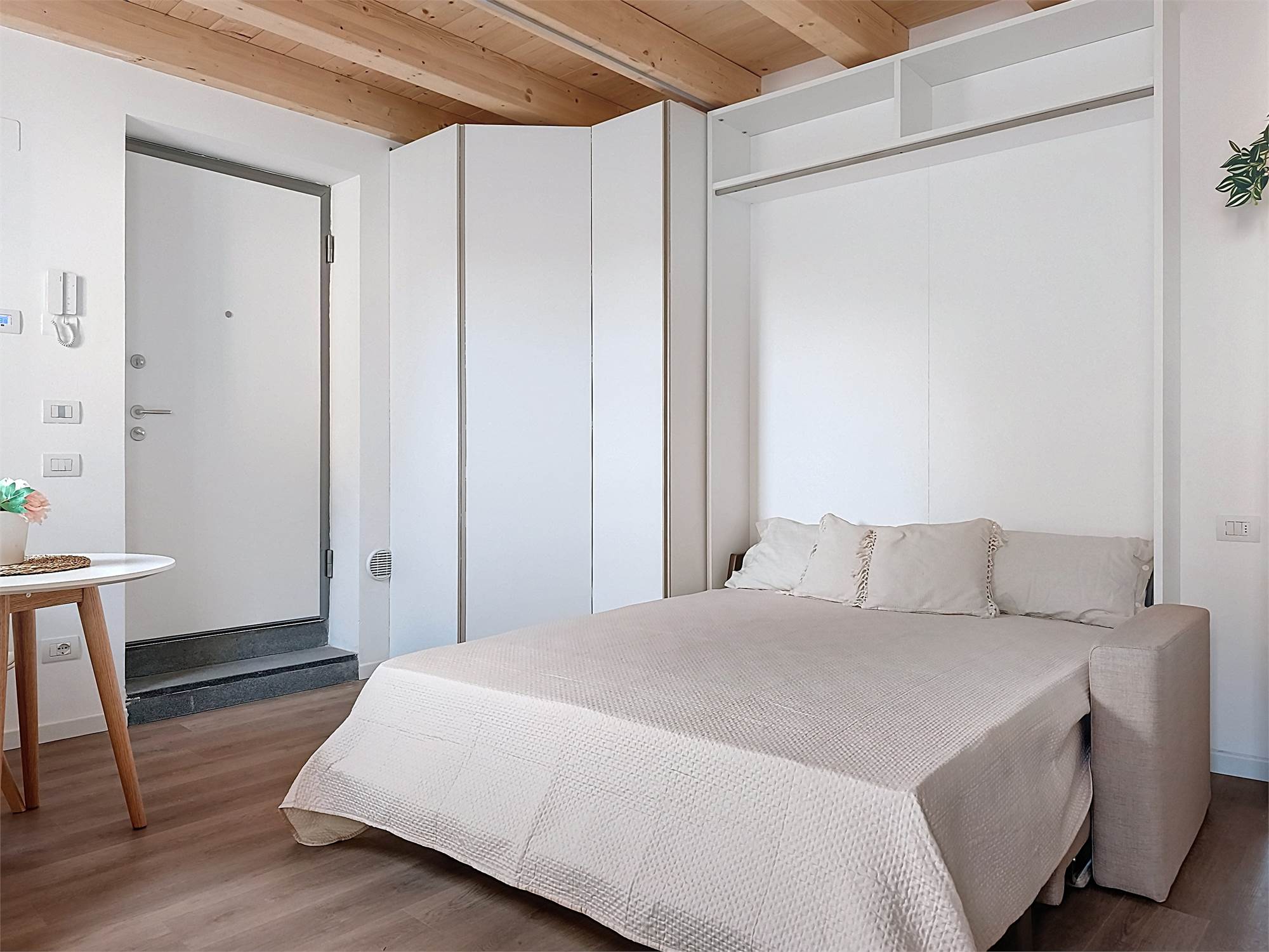 Il monolocale è completamente arredato su misura: dispone di ampia cucina completa di elettrodomestici, mobile divano letto ribaltabile, capiente cabina armadio, credenza, stoviglie e bagno finestrato con doccia e sanitari sospesi, molto spazioso con angolo lavatrice.
