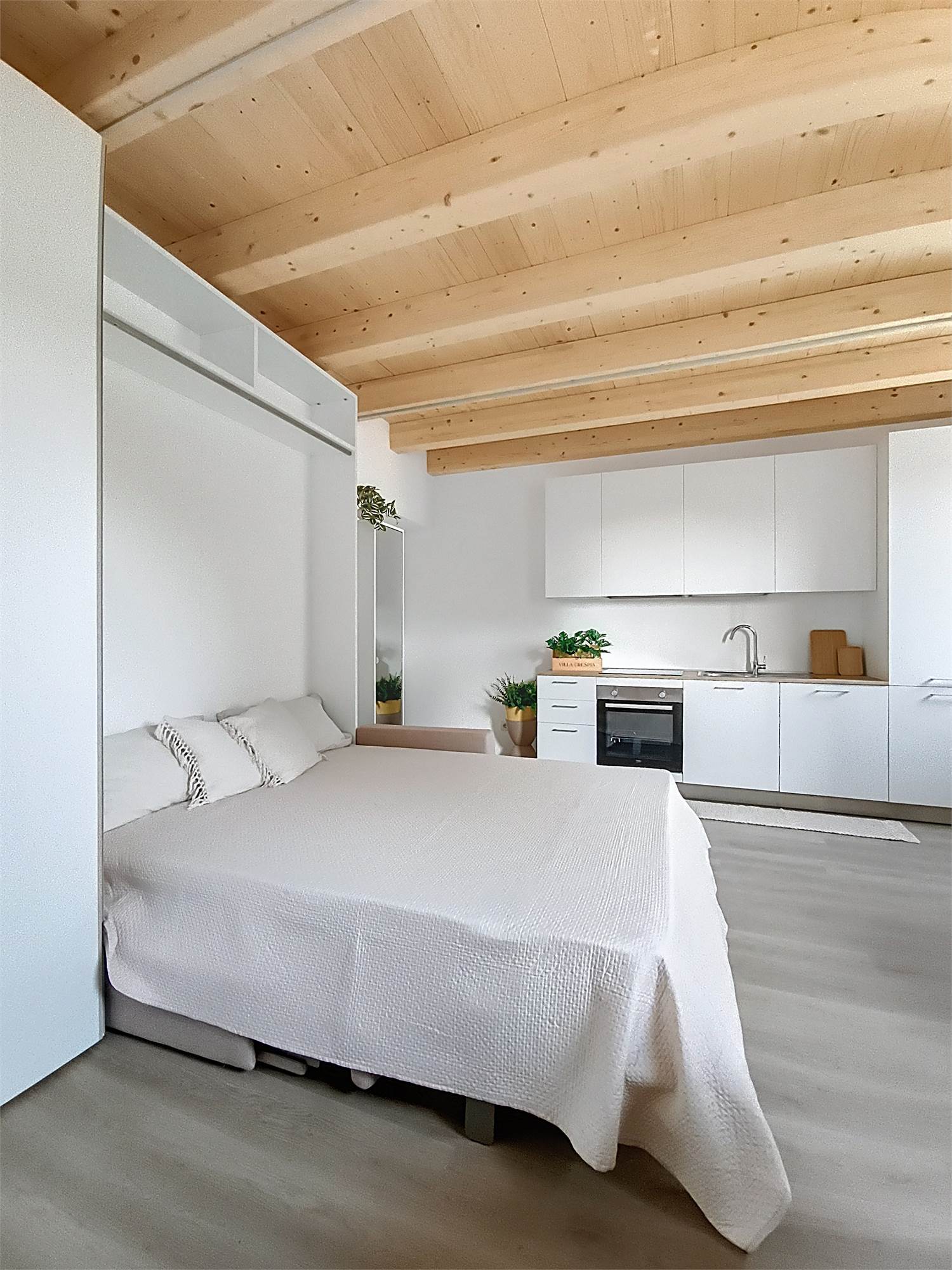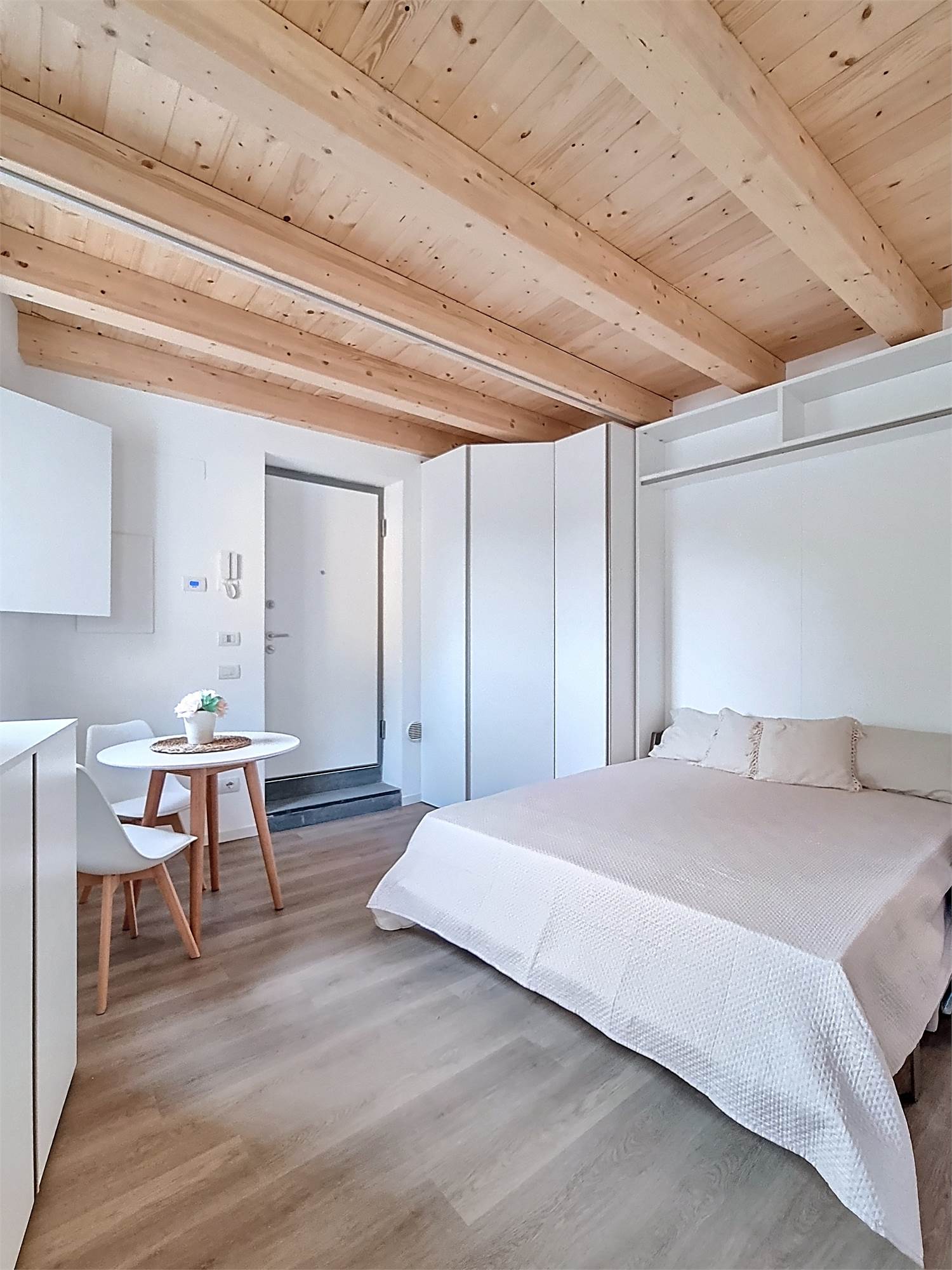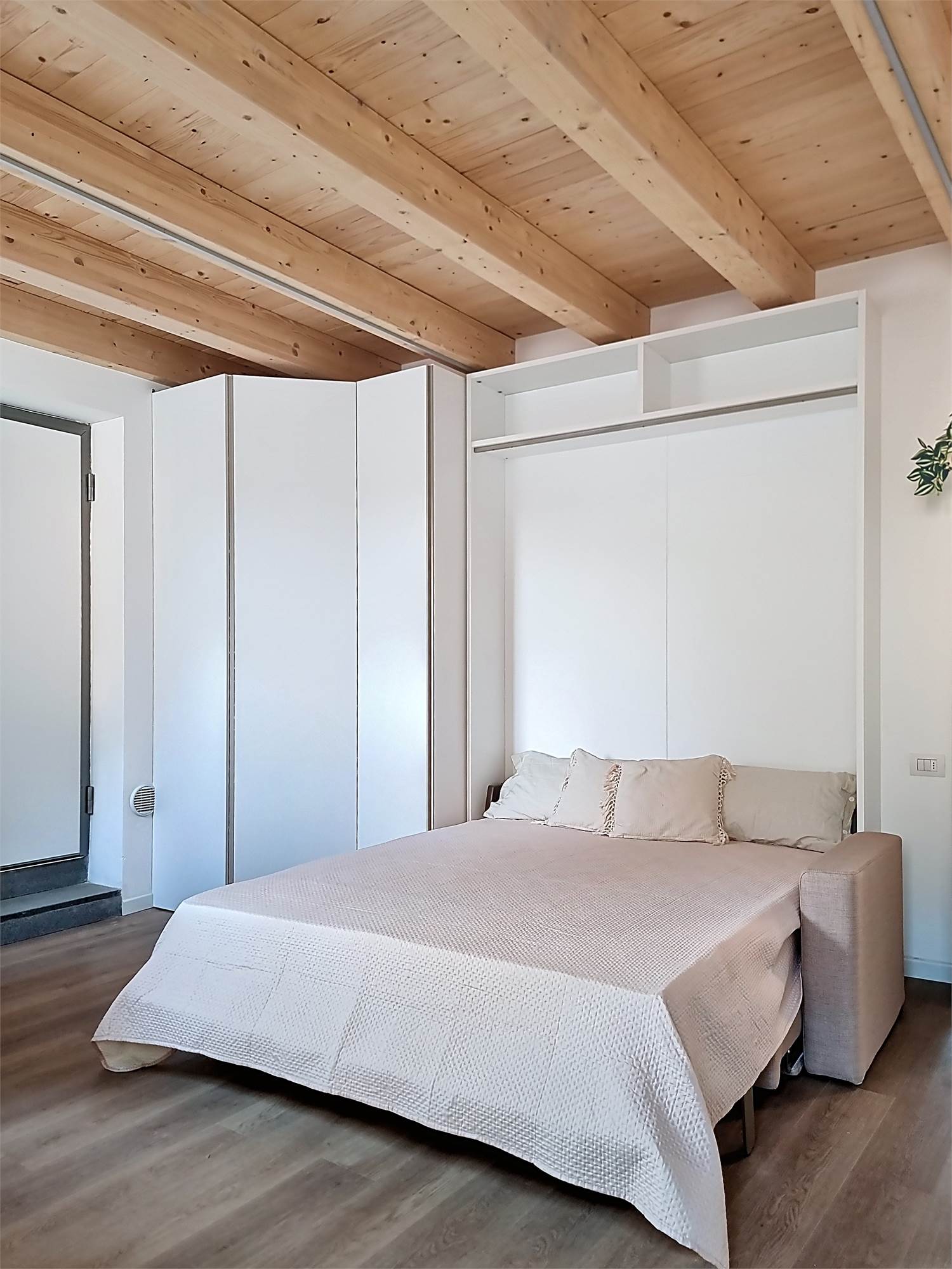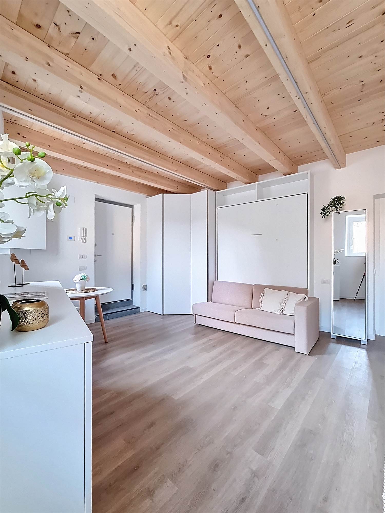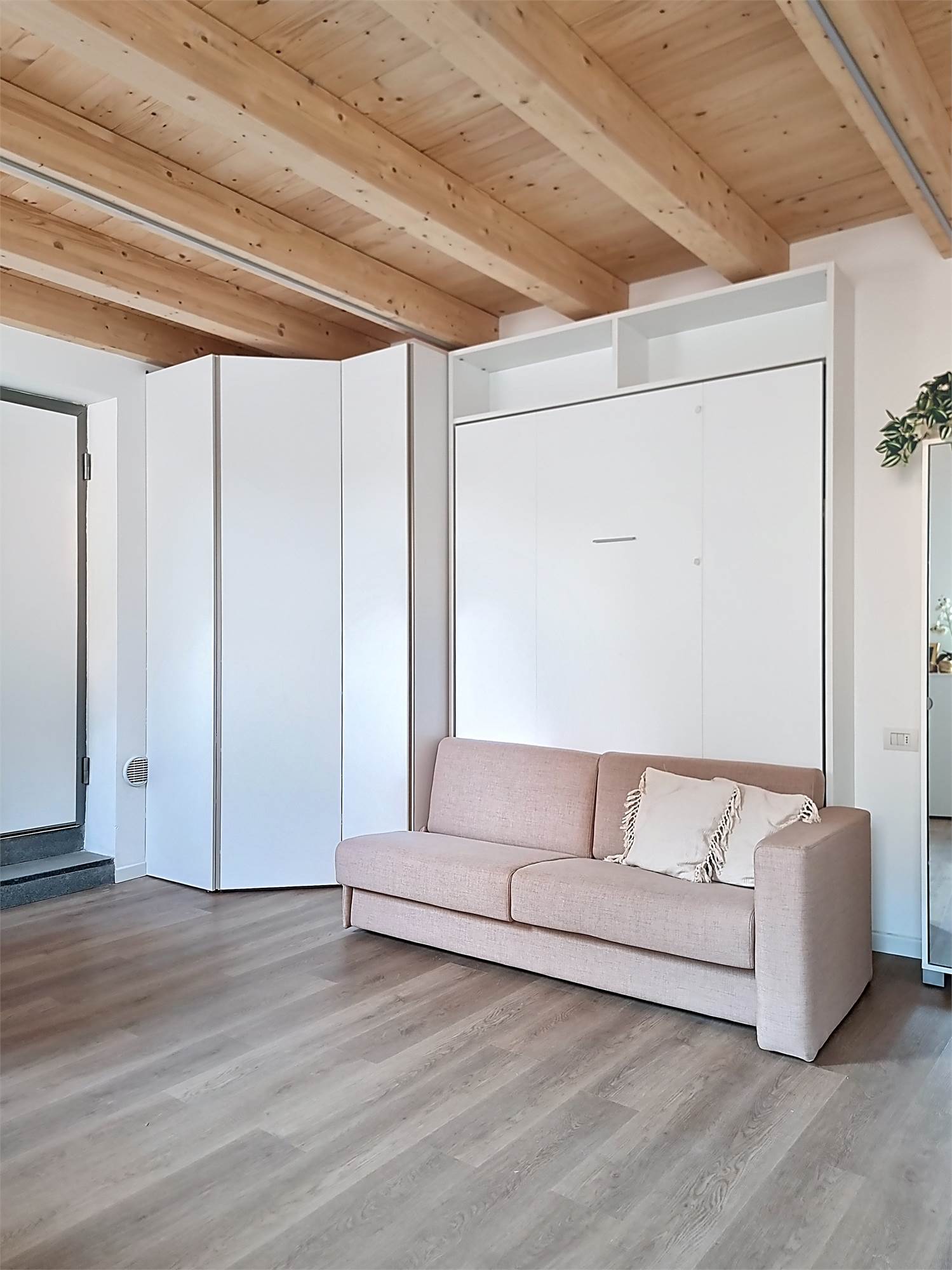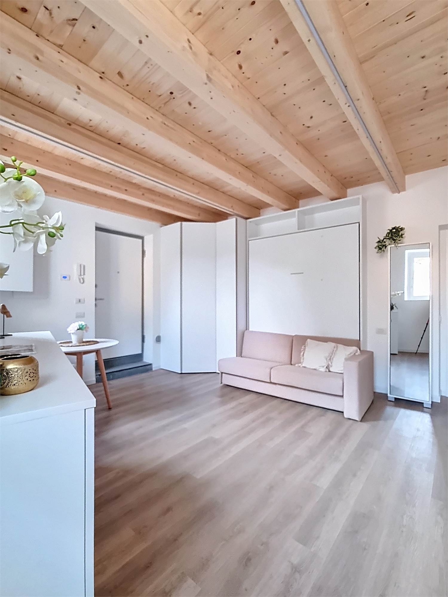 Il monolocale è completamente arredato su misura: dispone di ampia cucina completa di elettrodomestici, mobile divano letto ribaltabile, capiente cabina armadio, credenza, stoviglie e bagno finestrato con doccia e sanitari sospesi, molto spazioso con angolo lavatrice.