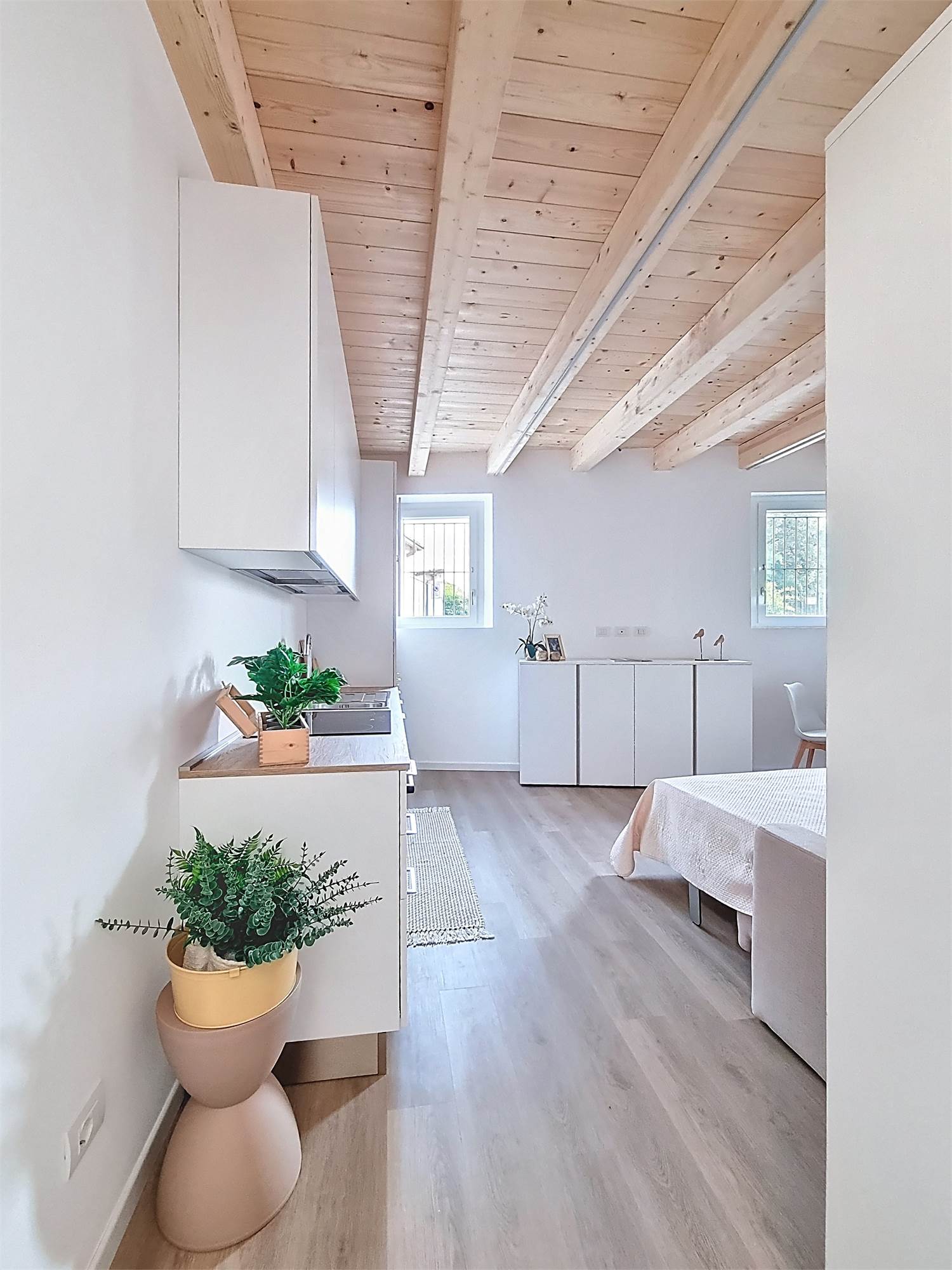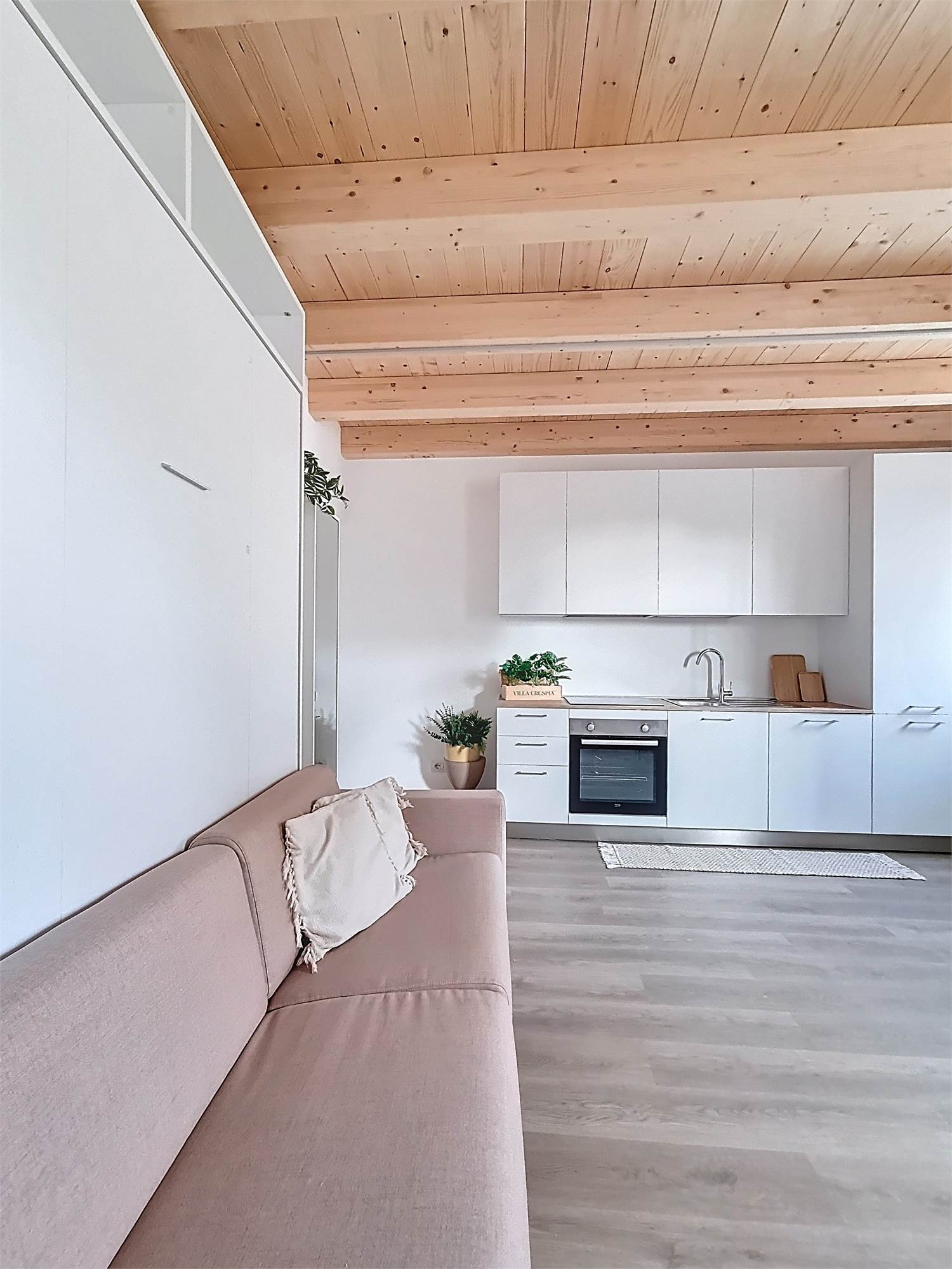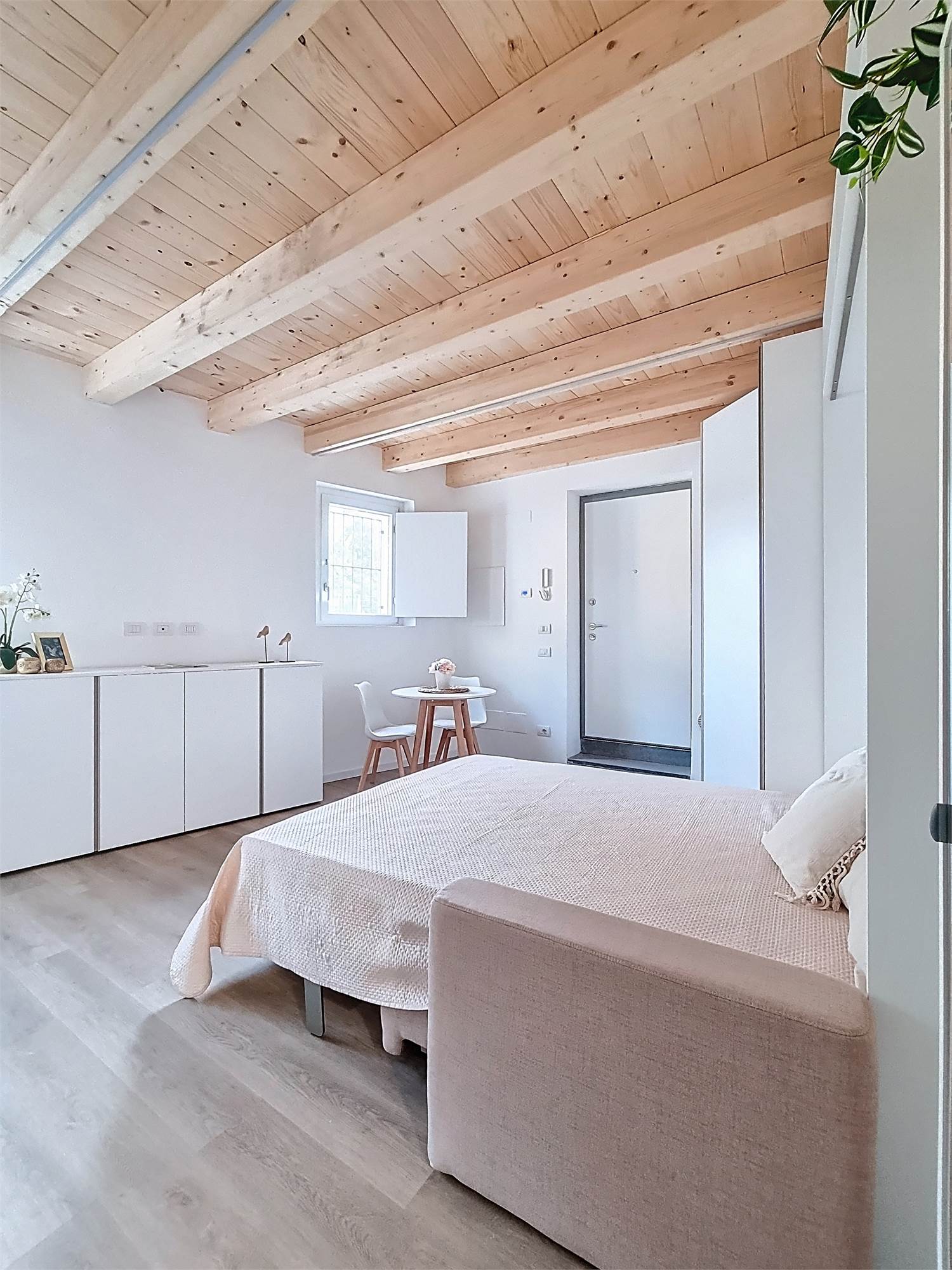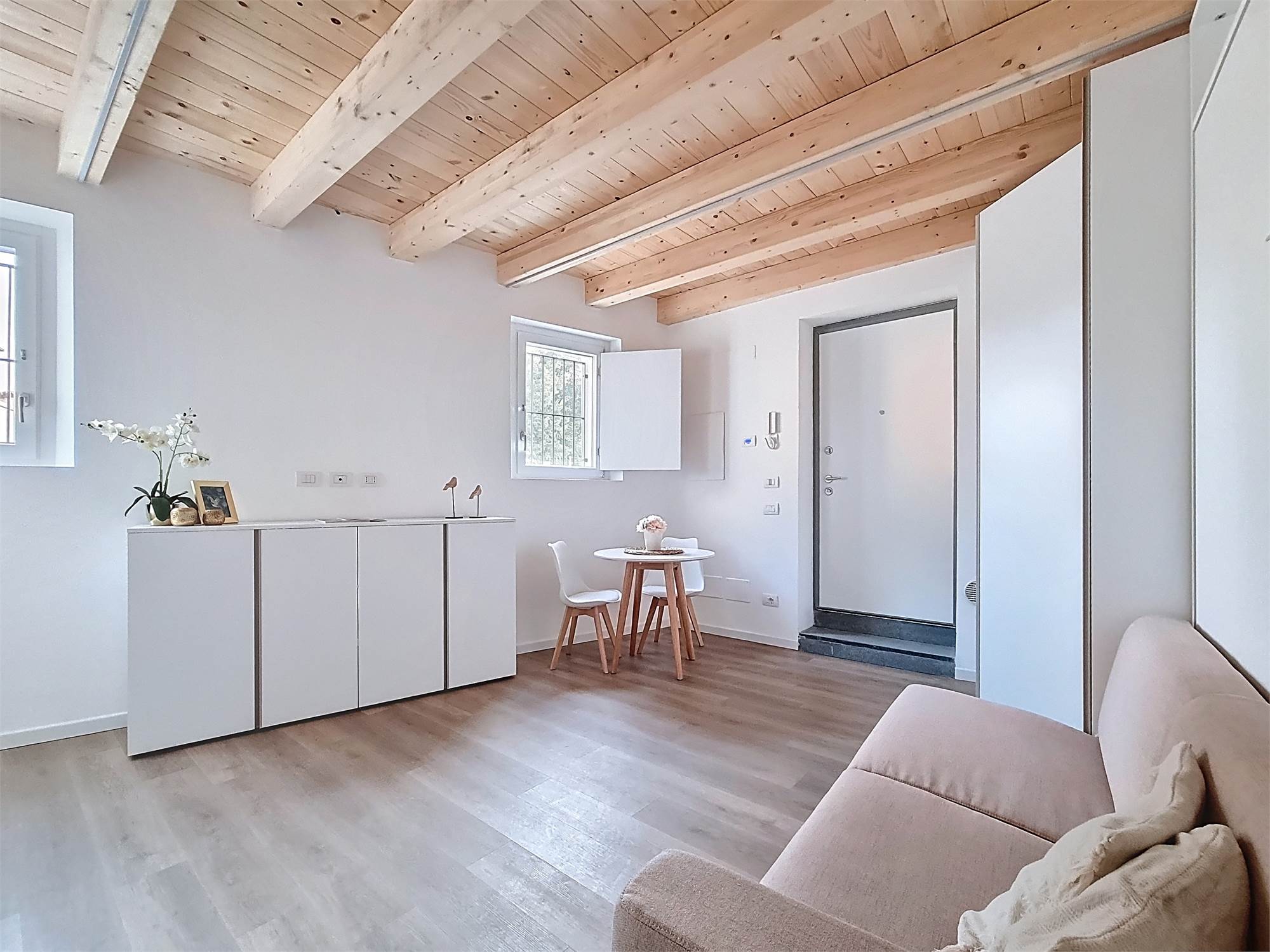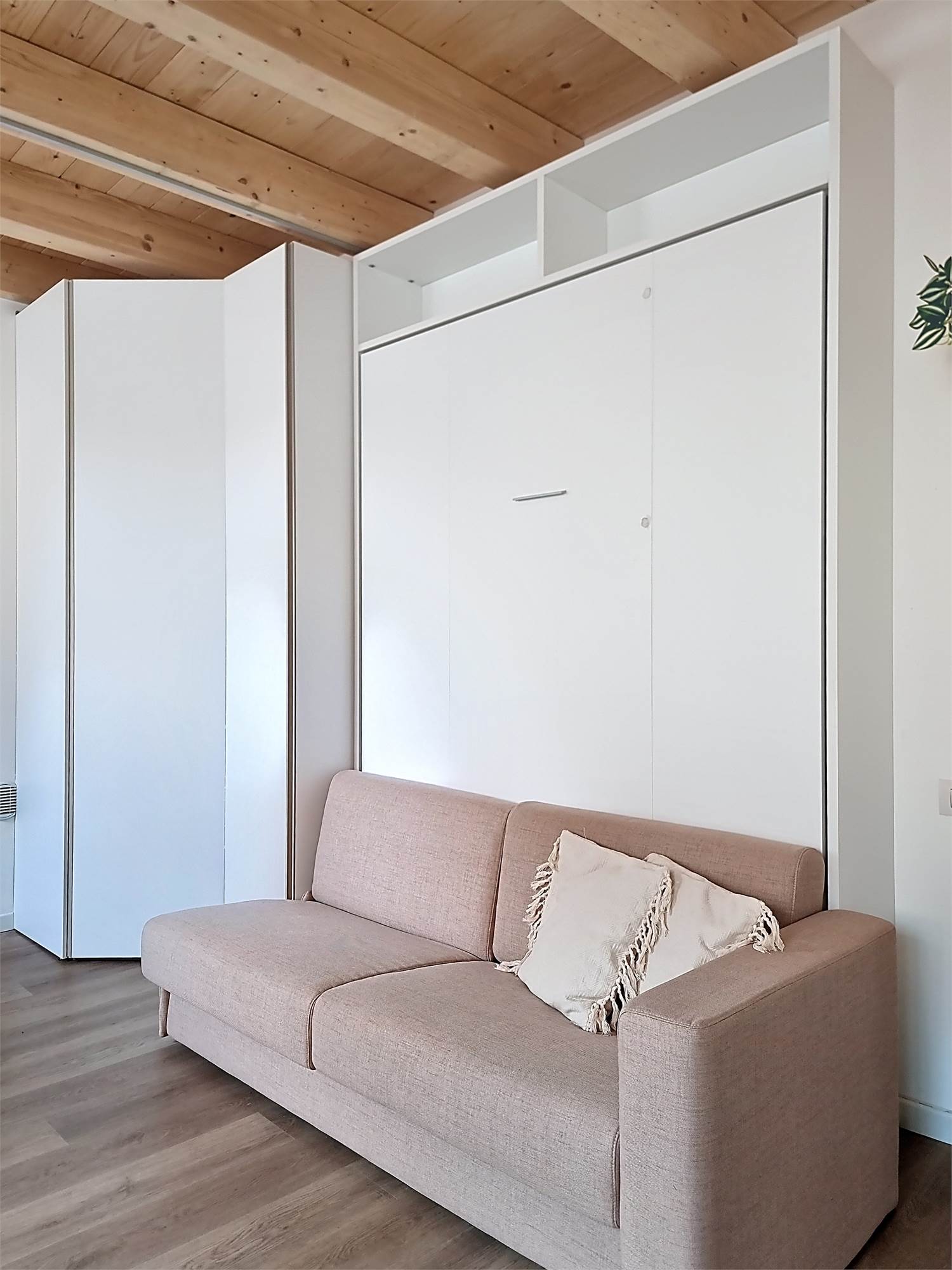 Il monolocale è completamente arredato su misura: dispone di ampia cucina completa di elettrodomestici, mobile divano letto ribaltabile, capiente cabina armadio, credenza, stoviglie e bagno finestrato con doccia e sanitari sospesi, molto spazioso con angolo lavatrice.
