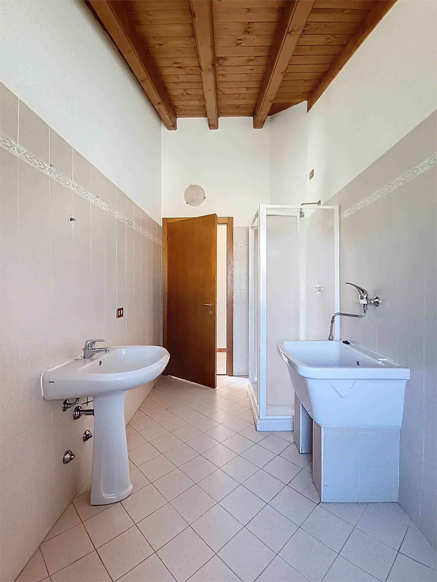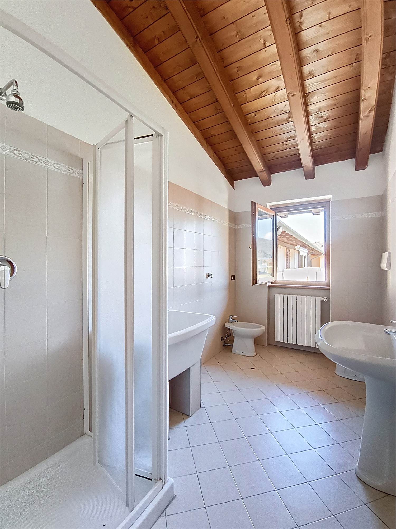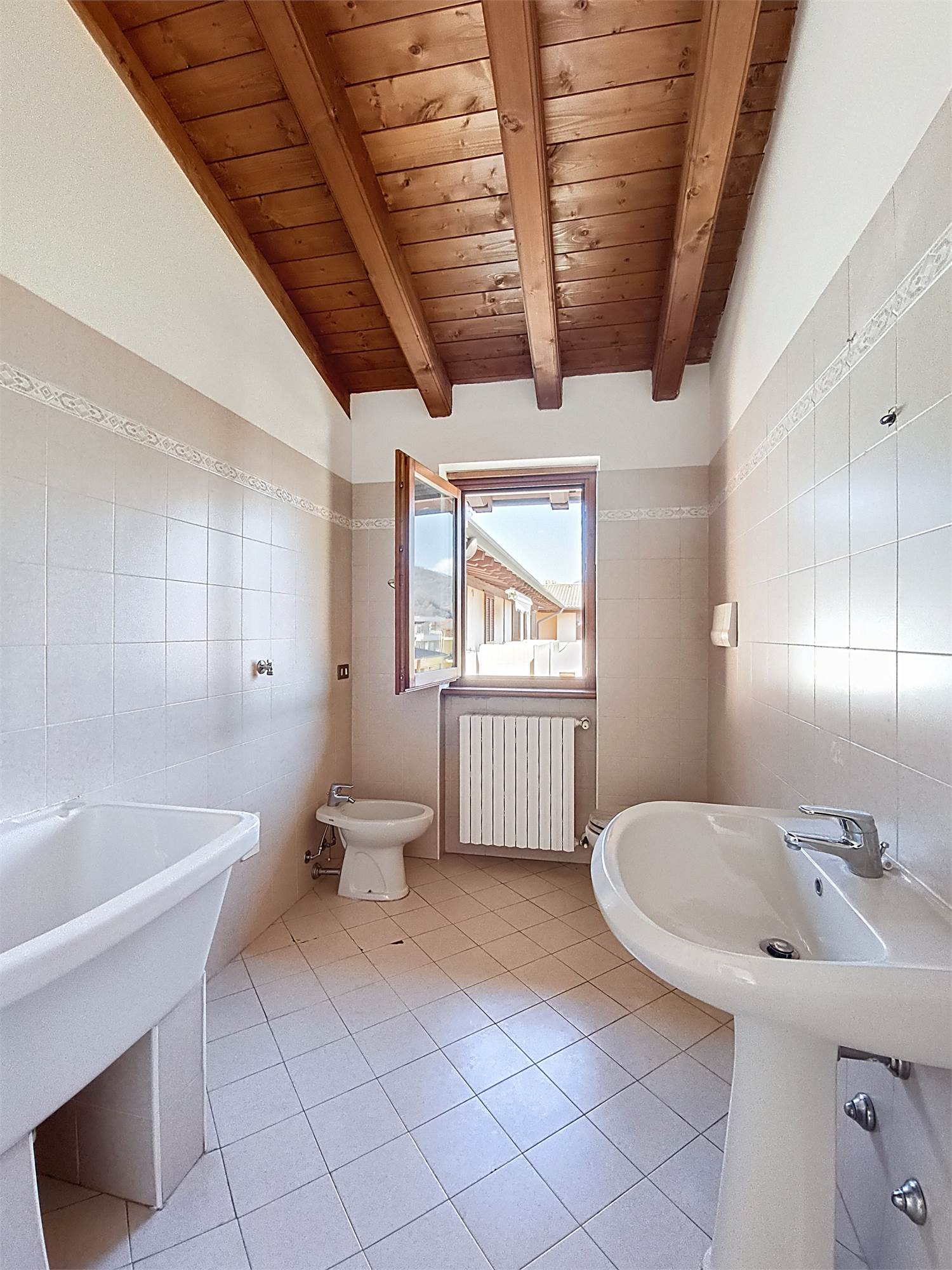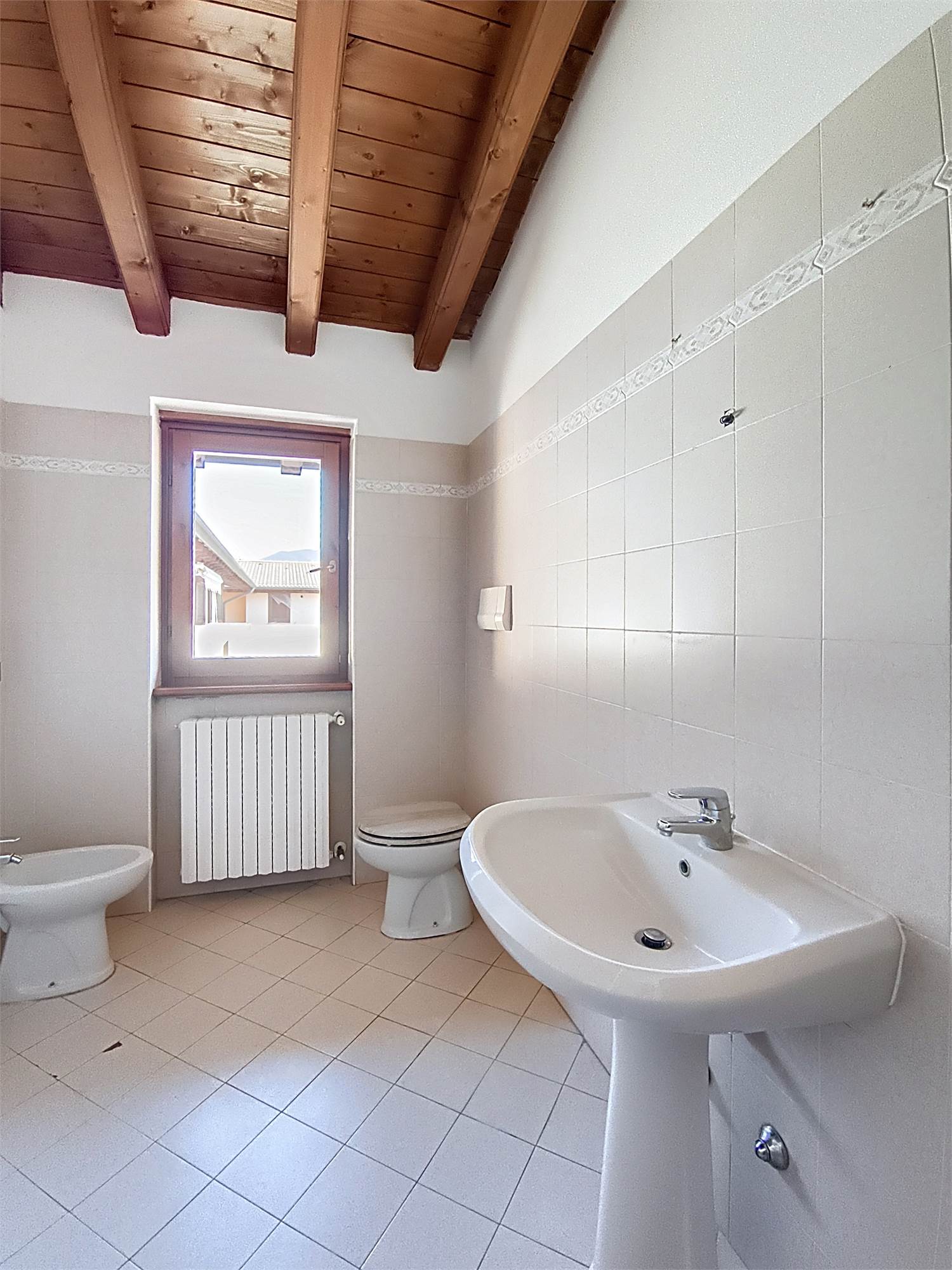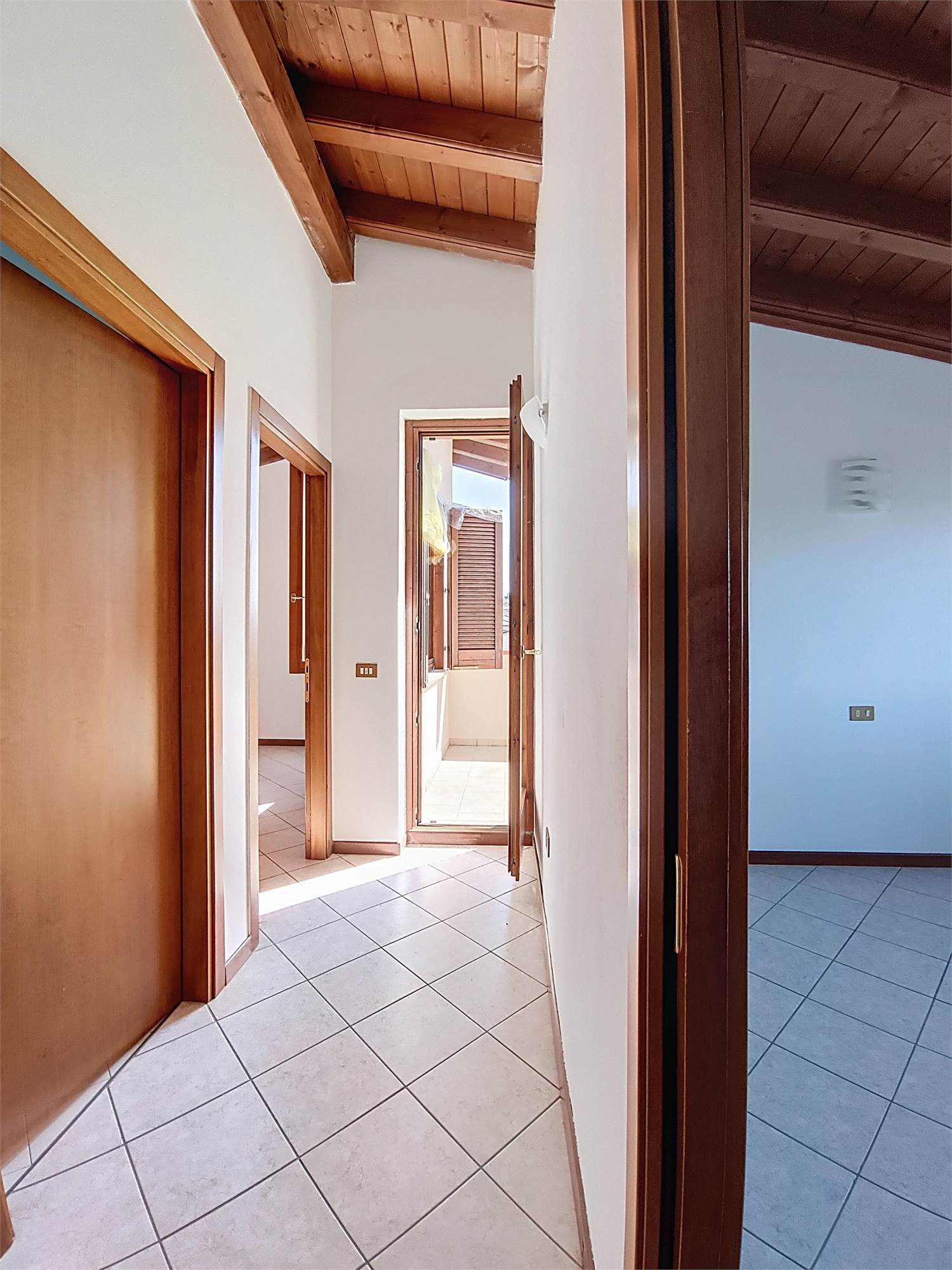 Al piano superiore si sviluppa la zona notte caratterizzata da eleganti travi a vista dove troviamo la seconda camera matrimoniale, una camera e il bagno/lavanderia finestrato con doccia.